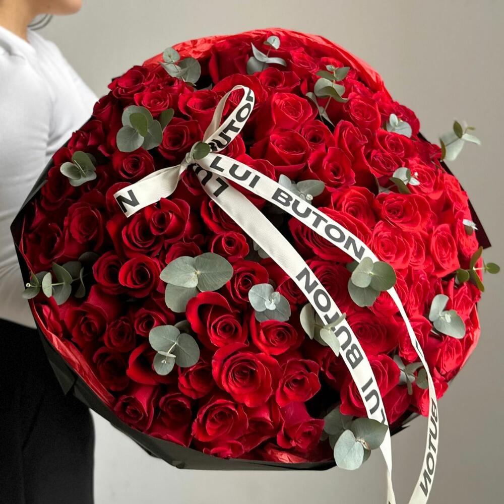 Букет из 101шт красных роз с эвкалиптом - идеальный выбор для признания, благодарности или просто знака внимания. Розы, которые говорят от сердца