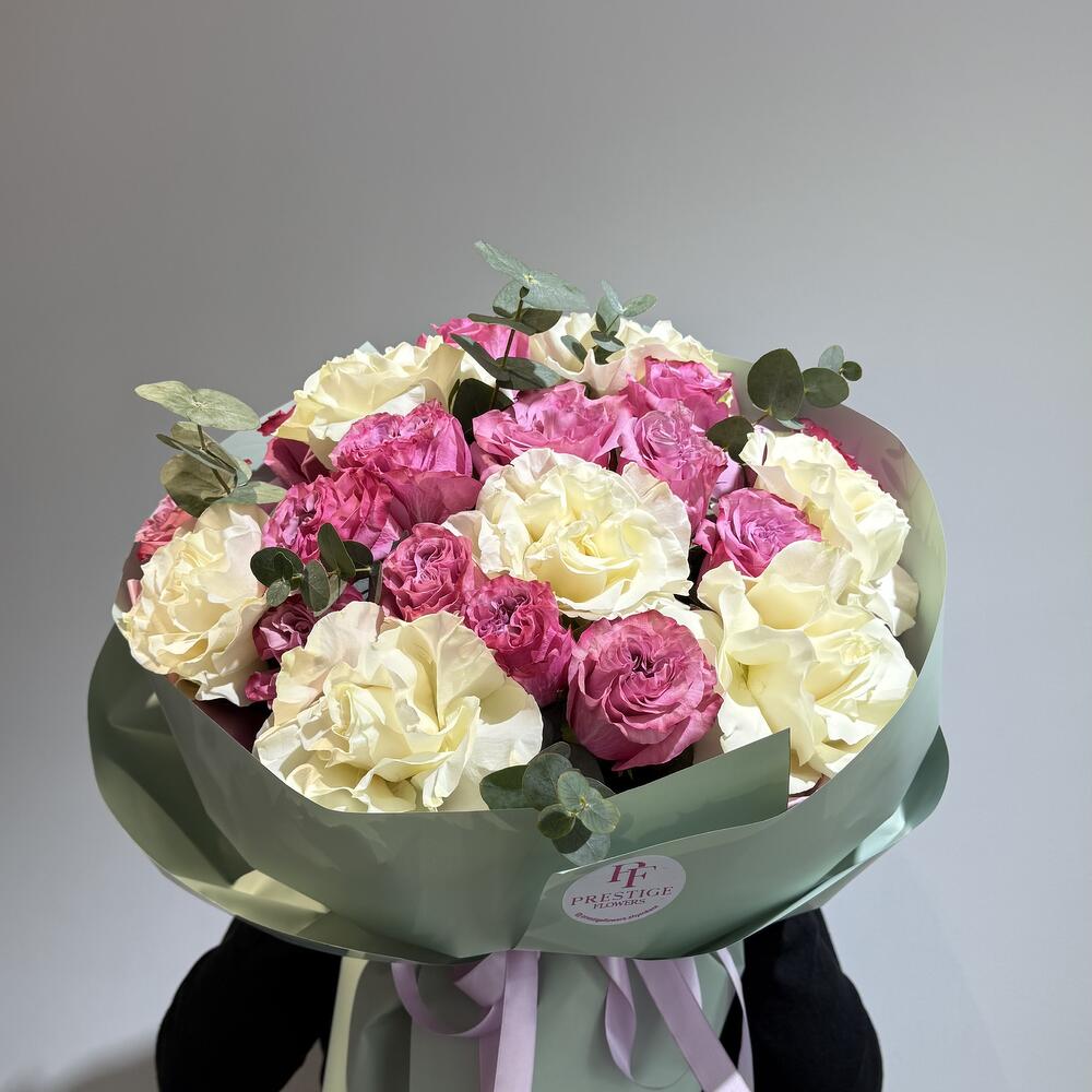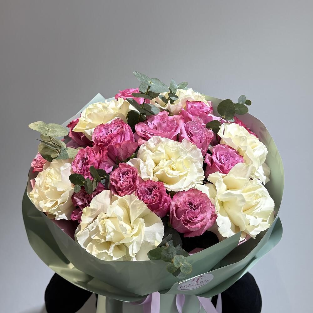 Голландская роза - 13 шт. Эвкалипт Baby Blue - 3 шт. Голландская белая роза - 6 шт.