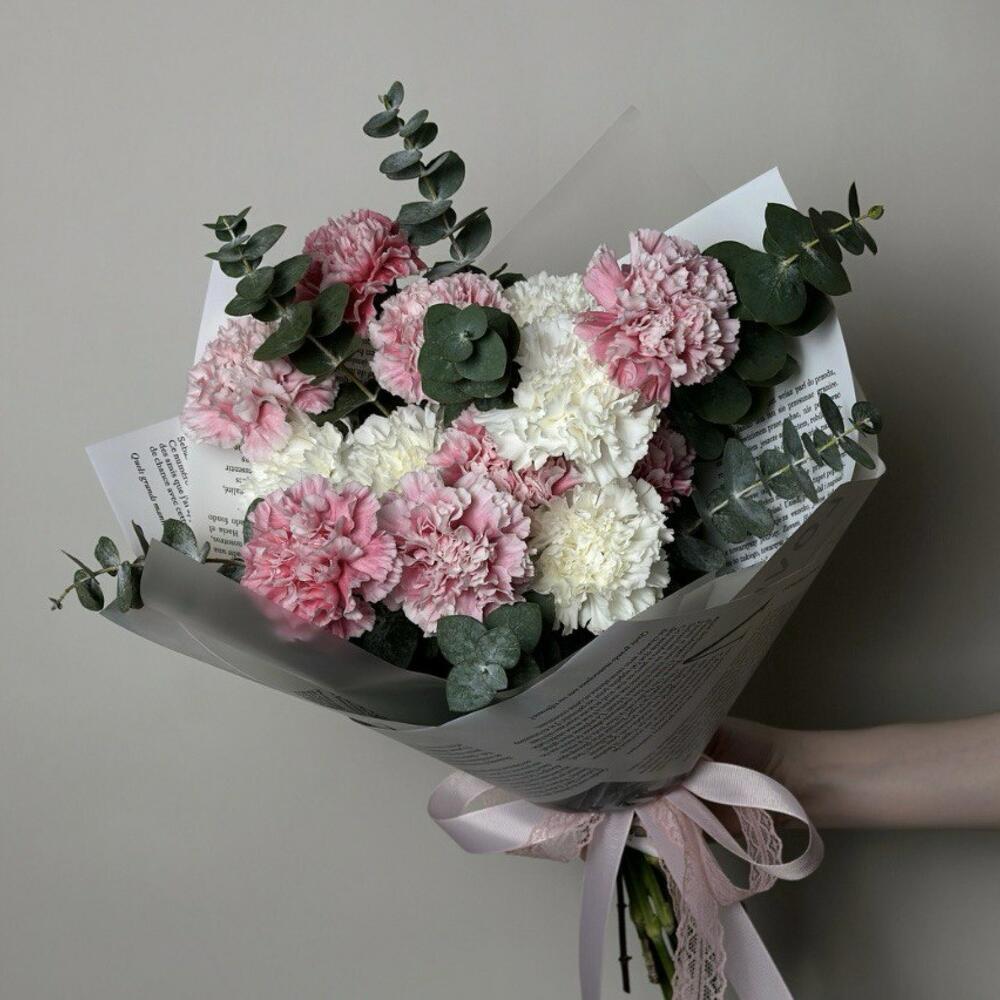 Эвкалипт - 2 шт. Упаковка - 1 шт. Диантус - 15 шт. Аквабокс - 1 шт. Фисташка пучок - 1 шт. переноска для цветов - 1 шт.