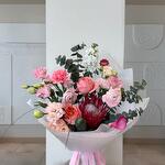 Калла - 1 шт. Маттиола - 1 шт. Протея - 1 шт. Эвкалипт - 1 шт. Гвоздика - 1 шт. Эустома - 4 шт. Роза пионовидная - 2 шт. Ранункулюс - 2 шт.