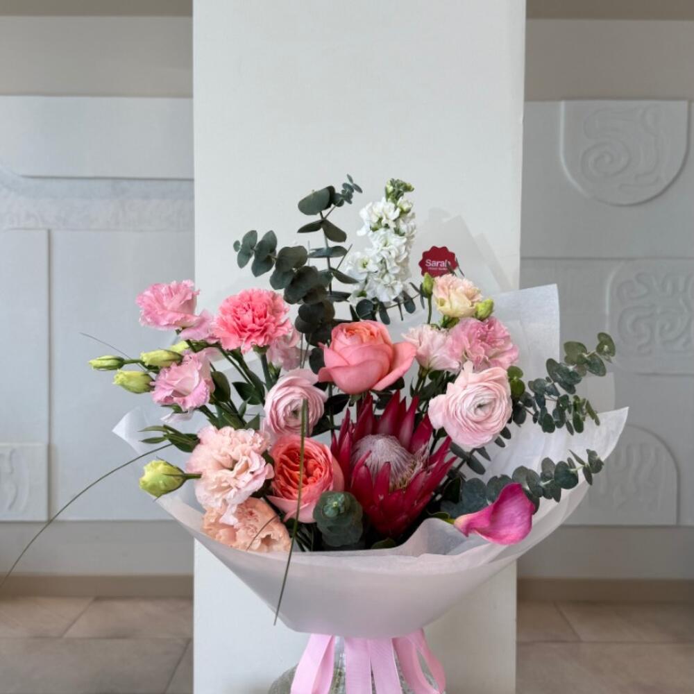 Калла - 1 шт. Маттиола - 1 шт. Протея - 1 шт. Эвкалипт - 1 шт. Гвоздика - 1 шт. Эустома - 4 шт. Роза пионовидная - 2 шт. Ранункулюс - 2 шт.