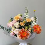 Краспедия - 2 шт. Маттиола - 2 шт. Эвкалипт - 1 шт. Эустома - 3 шт. Гербера - 2 шт. Роза пионовидная - 3 шт.