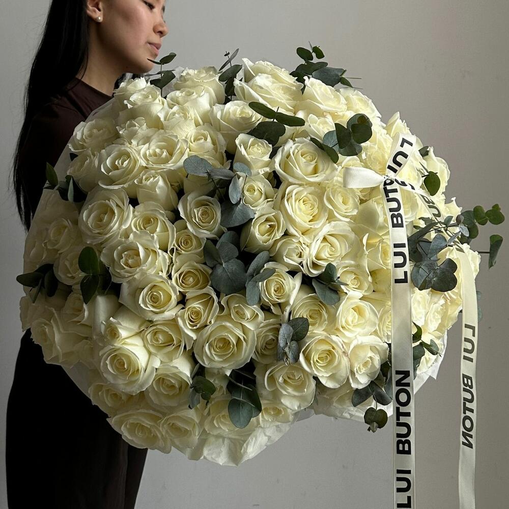 Букет "121 белых роз с эвкалиптом"