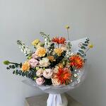 Краспедия - 3 шт. Маттиола - 3 шт. Эвкалипт - 1 шт. Гвоздика - 5 шт. Эустома - 4 шт. Гербера - 3 шт. Орнитогалум - 1 шт. Роза пионовидная - 4 шт. аллиум неополитанум - 1 шт.
