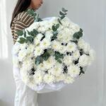 Букет из хризантем с эвкалиптом не оставит равнодушным. Он захватывает внимание и навсегда остаётся в памяти