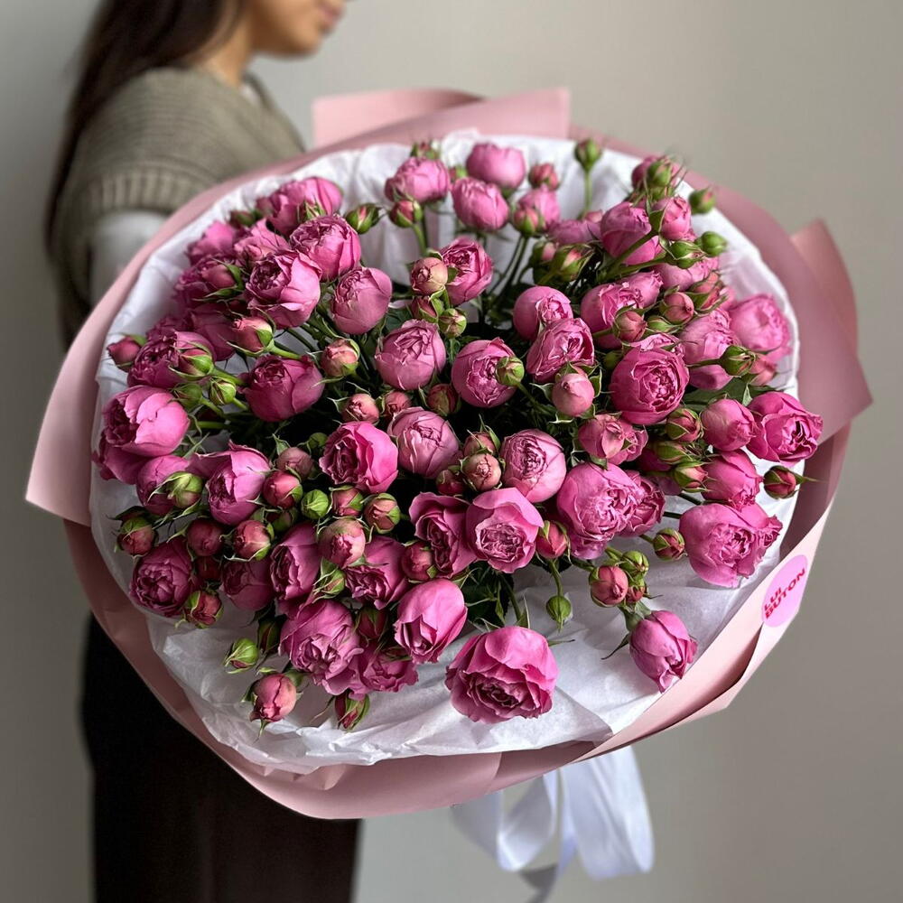 Этот букет покоряет своей аккуратной формой и живой текстурой — кустовые розы делают его выразительным и нежным