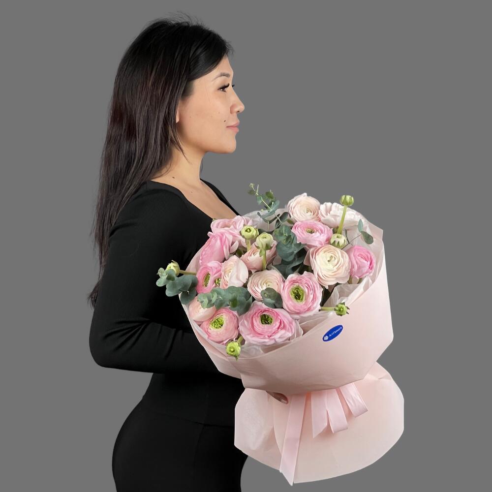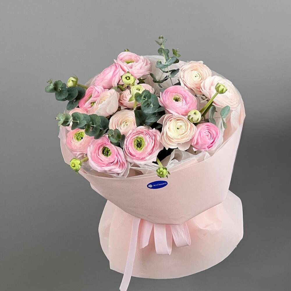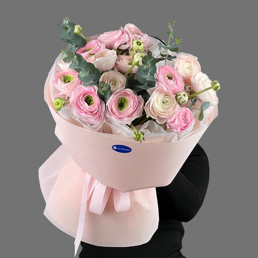 Букет «Ранункулюсовая сказка» Лёгкий, романтичный и воздушный букет из ранункулюсов с добавлением эвкалипта. Эти цветы, миниатюрные пионы, создают ощущение уюта и нежности.
