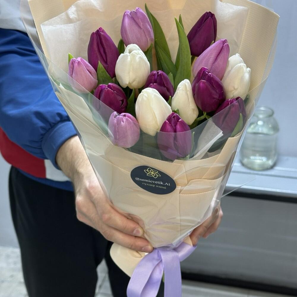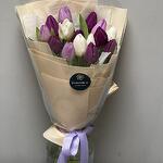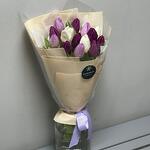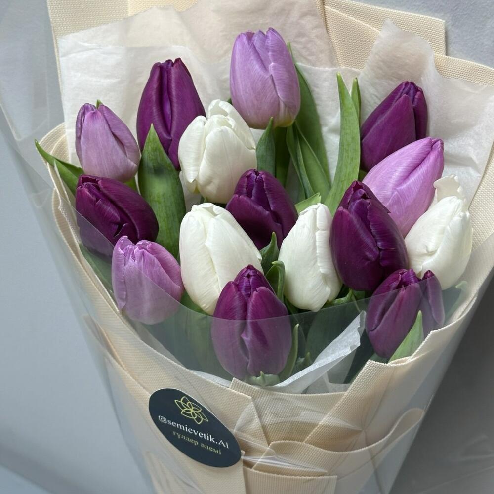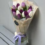 Этот изысканный букет сочетает в себе утонченную красоту и свежесть весеннего настроения. 15 тюльпанов в белом, фиолетовом и светло-фиолетовом оттенках создают яркое, но в то же время гармоничное сочетание цветов, символизируя начало нового и яркого. Белая бумага тишью придает композиции легкость и нежность, а прозрачная пленка добавляет свежести и воздушности. Бежевый фоамиран, мягко обвивающий цветы, дарит букету стильный и современный вид, а фиолетовая репсовая лента становится ярким акцентом, подчеркивающим утонченность всей композиции. Оформленный в бежевых тонах, этот букет идеально подойдет для весенних торжеств, дня рождения или как знак внимания для того, кто ценит красоту и гармонию. Он наполнит пространство теплотой, элегантностью и радостью.