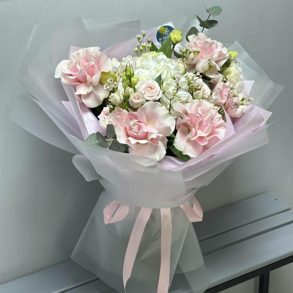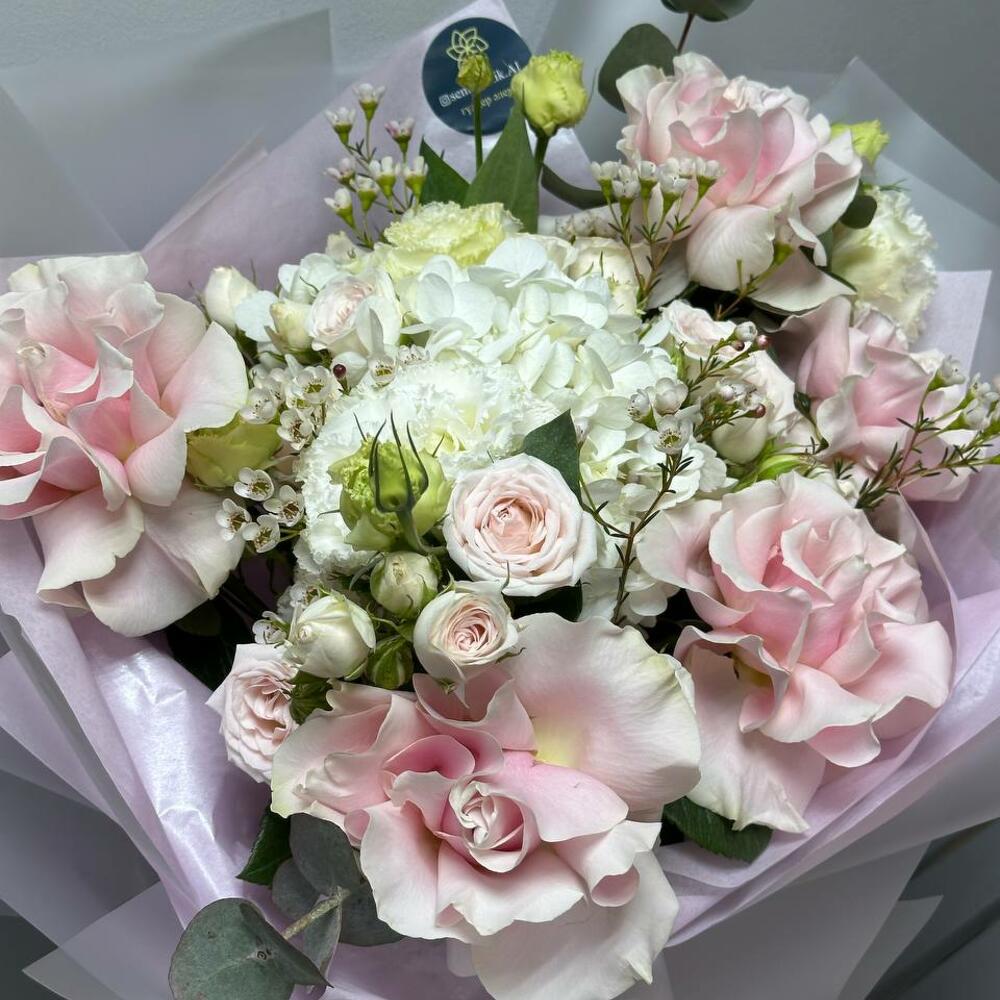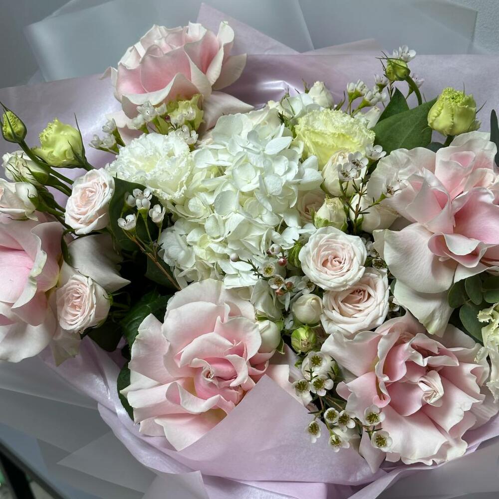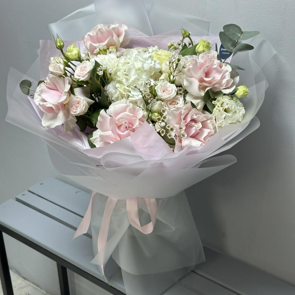 🌸 Букет “Воздушная нежность” 🌸 Этот изысканный букет – воплощение утончённости и лёгкости, созданный, чтобы выразить самые трепетные чувства. Его пастельные оттенки и текстуры идеально подчёркивают элегантность момента. 🌺 Состав: • Нежно-розовые розы (5 шт.) – символ любви и грации. • Пышная белая гортензия (1 шт.) – олицетворение изобилия и искренности. • Утончённый белый лизиантус (4 шт.) – знак чистоты и нежности. • Белые спрей-розы (4 шт.) добавляют изысканности и воздушности. • Восковой цветок (3 шт.) – тонкий декоративный акцент. • Эвкалипт Цинерия (3 веточки) придаёт букету свежесть и динамичность. 🎀 Оформление: • Бумага тишью нежно-розового цвета добавляет мягкости и романтики. • Матовая полупрозрачная плёнка (6 листов) подчёркивает современный стиль. • Лента репсовая в нежно-розовом оттенке завершает композицию утончённым штрихом. 📌 Подходит для: • Признания в чувствах. • Свадебного подарка. • Изящного комплимента для любимого человека. Подарите мгновение красоты и вдохновения!