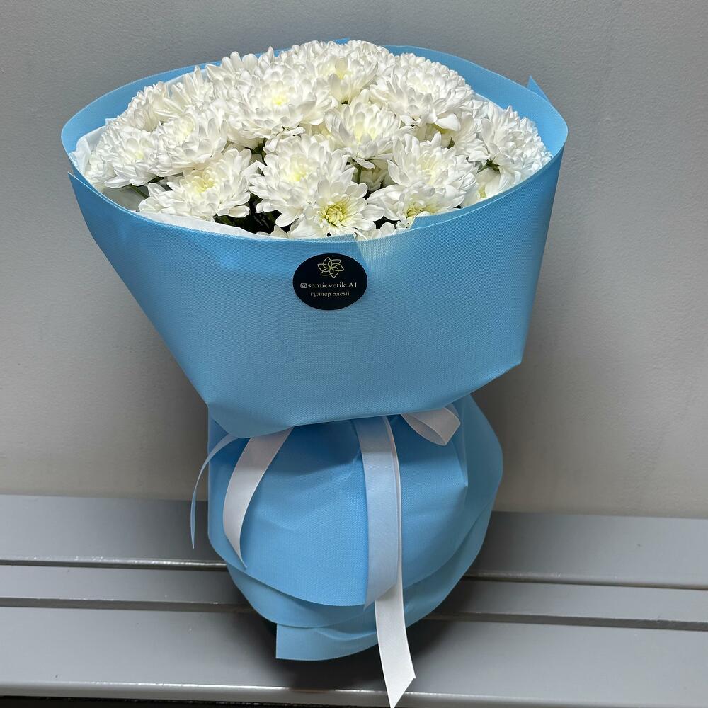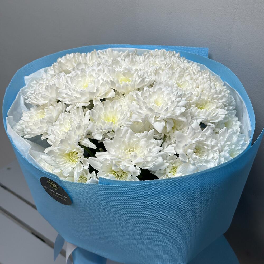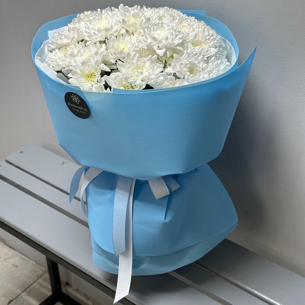 Этот изысканный букет — воплощение нежности и свежести! ✨ Белоснежные хризантемы Балтика 🌿 словно пушистые облака, окутанные небесно-голубым оформлением 🎀. Легкая бумага тишью и мягкий фоамиран создают воздушное ощущение утренней прохлады, а изящные ленты добавляют нотку элегантности. 💙 Идеальный подарок, который подарит тепло, радость и восхищение! 💐💫