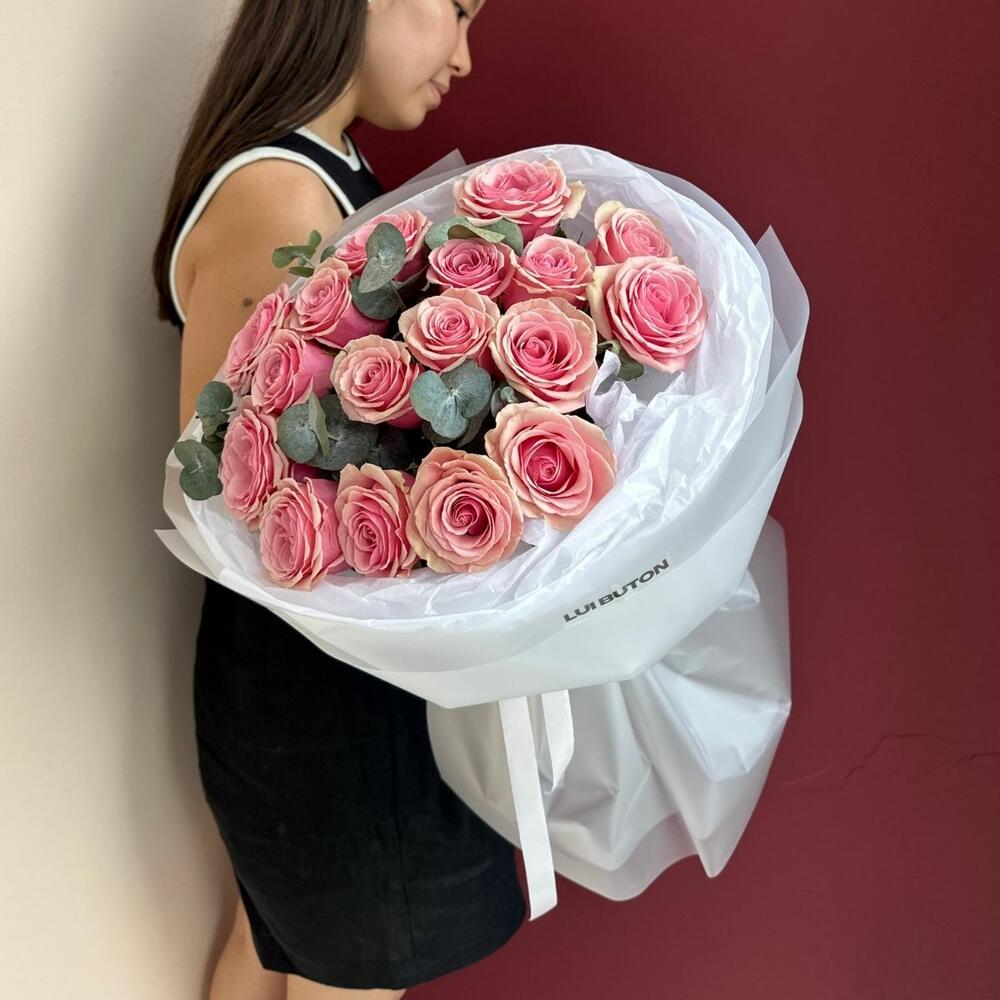 Букет из 17шт роз сорта джералдин с эвкалиптом, который говорит о чувствах без слов — просто красиво