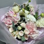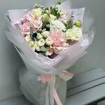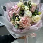 Этот утонченный и воздушный букет словно соткан из лепестков нежности! 💕 Благородные нежно-розовые розы и их изысканные спрей-собратья 🌸 переплетаются с белоснежными хризантемами и утонченным лизиантусом, создавая ощущение легкости и романтики. Аккуратные веточки воскового цветка и эвкалипта цинерия 🌿 добавляют свежести и природной изысканности. Полупрозрачное матовое оформление в мягких сиренево-розовых тонах, дополненное элегантными лентами 🎀, делает этот букет по-настоящему нежным и стильным. Идеальный выбор для тех, кто ценит красоту в деталях! ✨
