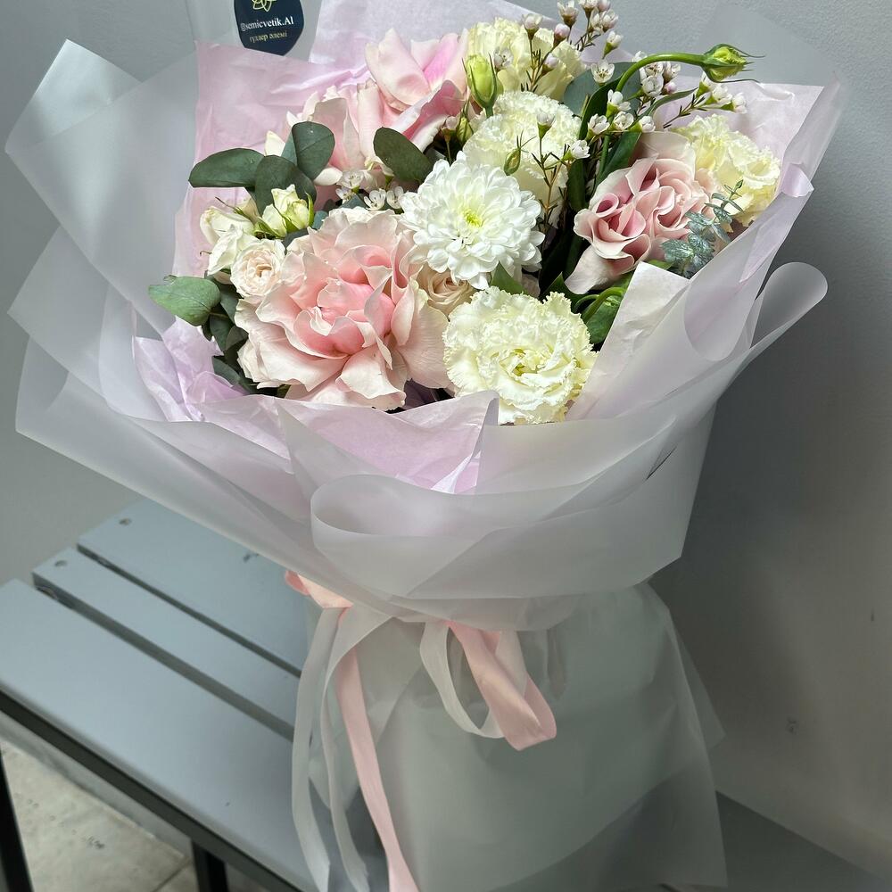 Этот утонченный и воздушный букет словно соткан из лепестков нежности! 💕 Благородные нежно-розовые розы и их изысканные спрей-собратья 🌸 переплетаются с белоснежными хризантемами и утонченным лизиантусом, создавая ощущение легкости и романтики. Аккуратные веточки воскового цветка и эвкалипта цинерия 🌿 добавляют свежести и природной изысканности. Полупрозрачное матовое оформление в мягких сиренево-розовых тонах, дополненное элегантными лентами 🎀, делает этот букет по-настоящему нежным и стильным. Идеальный выбор для тех, кто ценит красоту в деталях! ✨