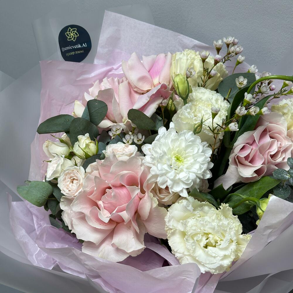 Ваксфлауэр - 2 шт. Лизиантус Белый - 2 шт. Хризантема белая - 1 шт. Роза нежно-розовая - 4 шт. Эвкалипт цинерария - 1 шт. спрей роза нежно-розовая - 2 шт. аква бумага полупрозрачная матовая - 4 шт. бумага тишью нежно-фиолетовая - 3 шт. лента репсовая нежно-розовая и белая - 1 шт.