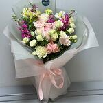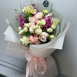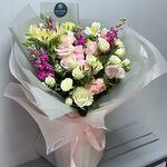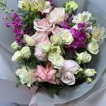 Букет “Розовый Вальс” 💕🌸 Этот букет — как нежная мелодия, полная лёгкости и гармонии. Четыре нежно-розовые розы 🌷 создают основу композиции, наполняя её мягкостью и теплом. Белые спрей-розы и альстромерии 🤍 добавляют утончённости и лёгкого сияния, словно первые лучи рассвета. Фиолетовая матиолла 💜 привносит нотку загадочности и изысканности, а белый лизиантус 🌼 и зелень фисташки 🌿 придают букету свежесть и воздушность. Оформление в нежно-розовых полосках с полупрозрачной серой аква-бумагой 🎀 подчёркивает элегантность композиции, создавая стильный и современный образ. Завершающий штрих — репсовая лента в нежно-розовом оттенке, добавляющая изящества и утончённости. Подарите лёгкий танец чувств и красоты — букет, который тронет сердце с первого взгляда. ✨🌸