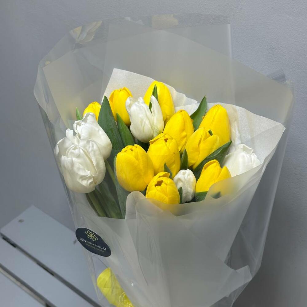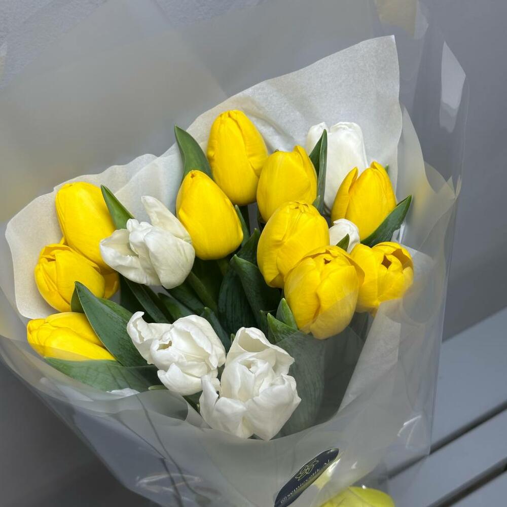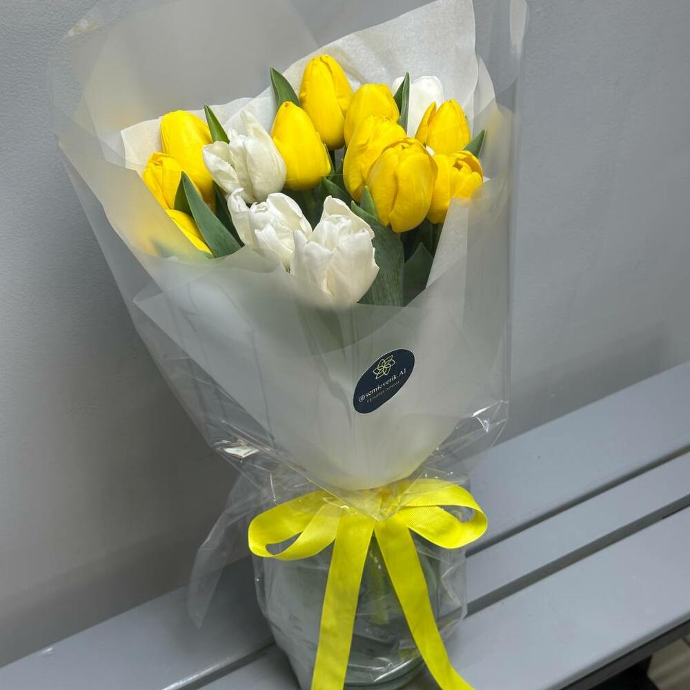 Букет «Солнечный бриз» ☀🌷 Лёгкий, воздушный и наполненный теплом – этот букет дарит радость с первого взгляда! Яркие жёлтые тюльпаны 🌼 сияют, как солнечные лучи, а белые тюльпаны 🤍 добавляют нежности и элегантности. Лёгкое оформление в серых и белых тонах 🩶 делает композицию стильной и утончённой, а жёлтая репсовая лента 🎀 придаёт финальный штрих гармонии. 🎁 Идеальный подарок, чтобы пожелать счастья, удачи и хорошего настроения!