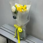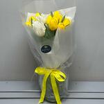 Тюльпан желтый - 10 шт. Тюльпан белый - 5 шт. бумага тишью белая - 3 шт. лента репсовая желтая - 1 шт. аква бумага полупрозрачная серая - 3 шт.
