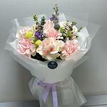 Букет «Лавандовая нежность» 💜🌿 Изысканный и утончённый, этот букет сочетает в себе романтику и свежесть. Нежные розовые розы 🌸 наполняют композицию мягкостью, а фиолетовая маттиола 💜 добавляет глубину и аристократичность. Белоснежный лизиантус 🤍 придаёт воздушность, а эвкалипт 🌿 освежает букет лёгкими зелёными нотами. Полупрозрачное серое оформление 🩶 подчёркивает изящество цветов, а светло-фиолетовая лента 🎀 завершает образ элегантным акцентом. 🎁 Прекрасный подарок для утончённых натур, которые ценят стиль и гармонию!