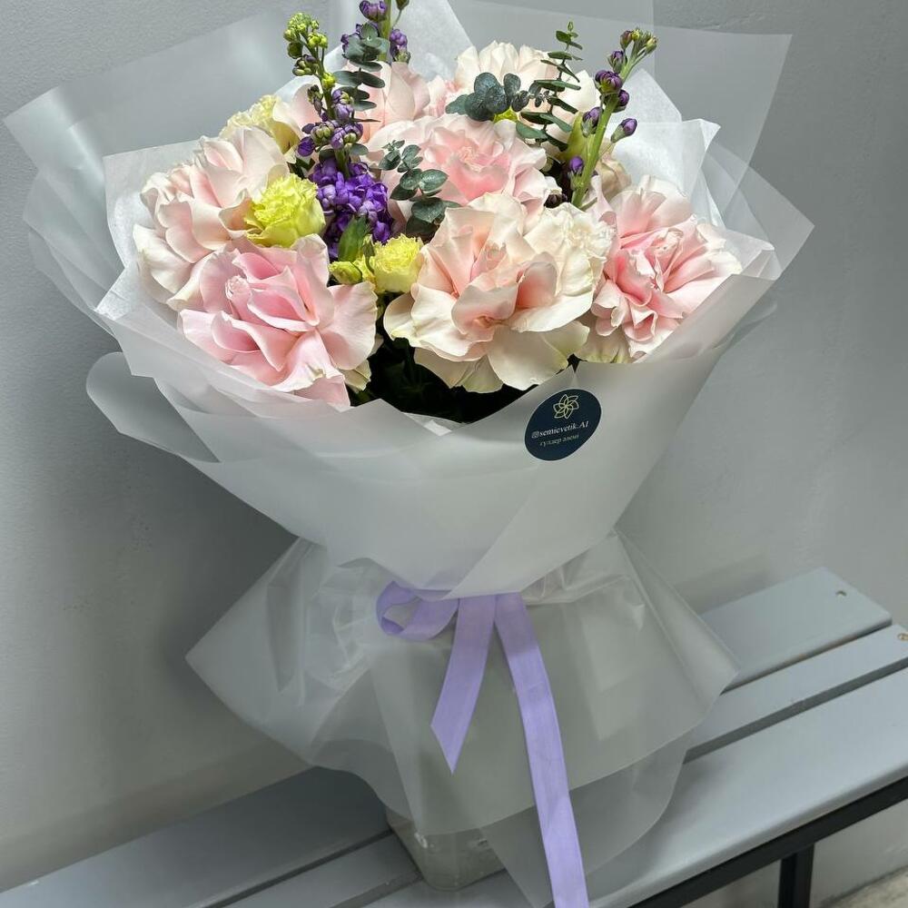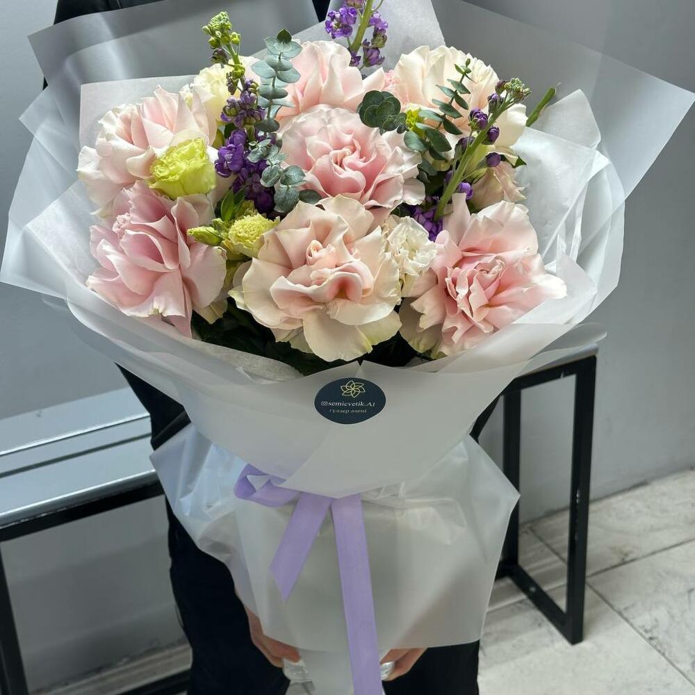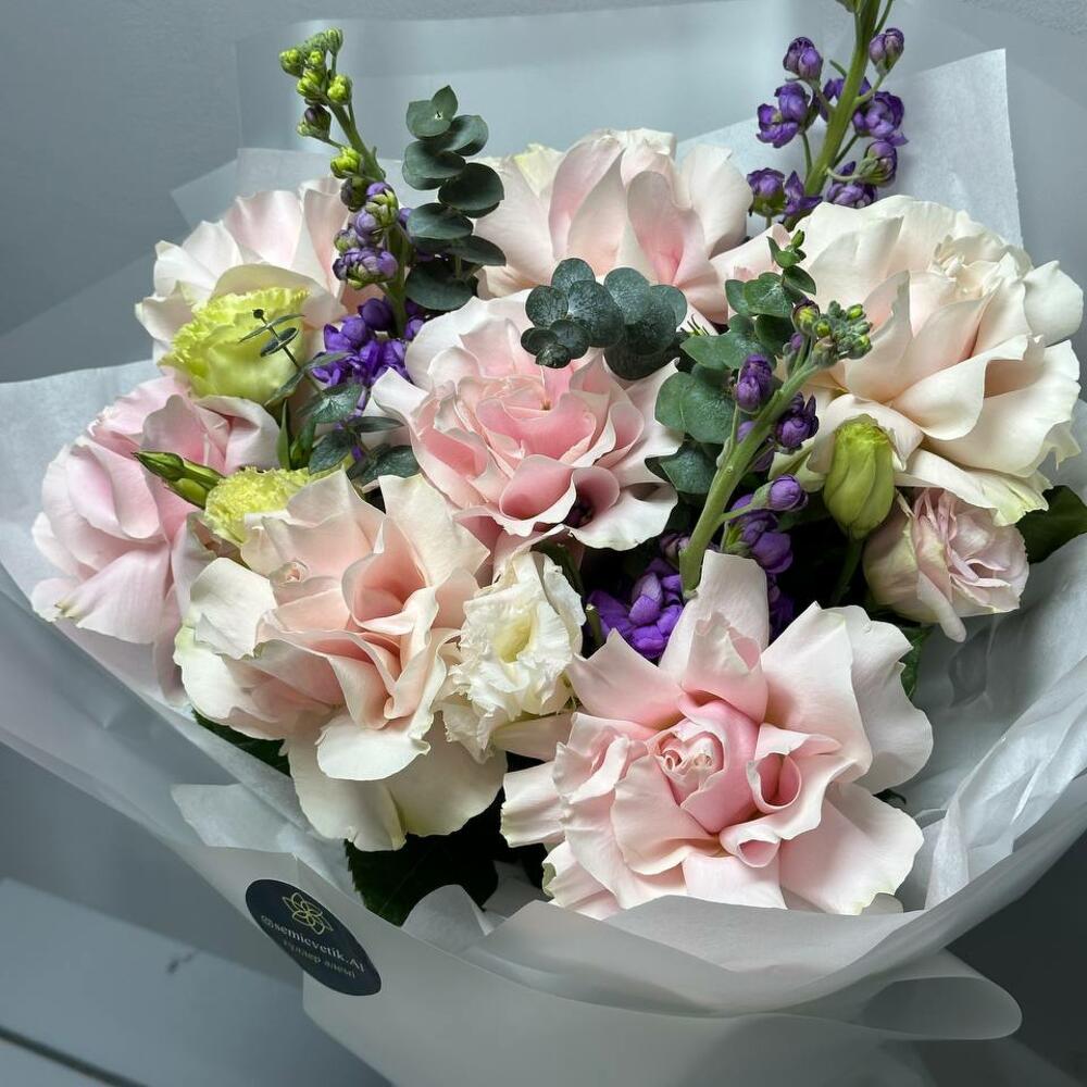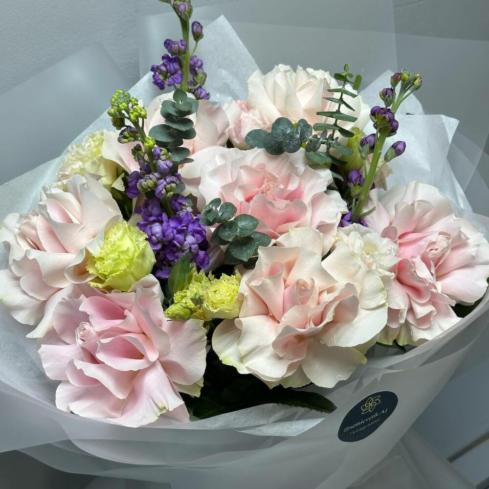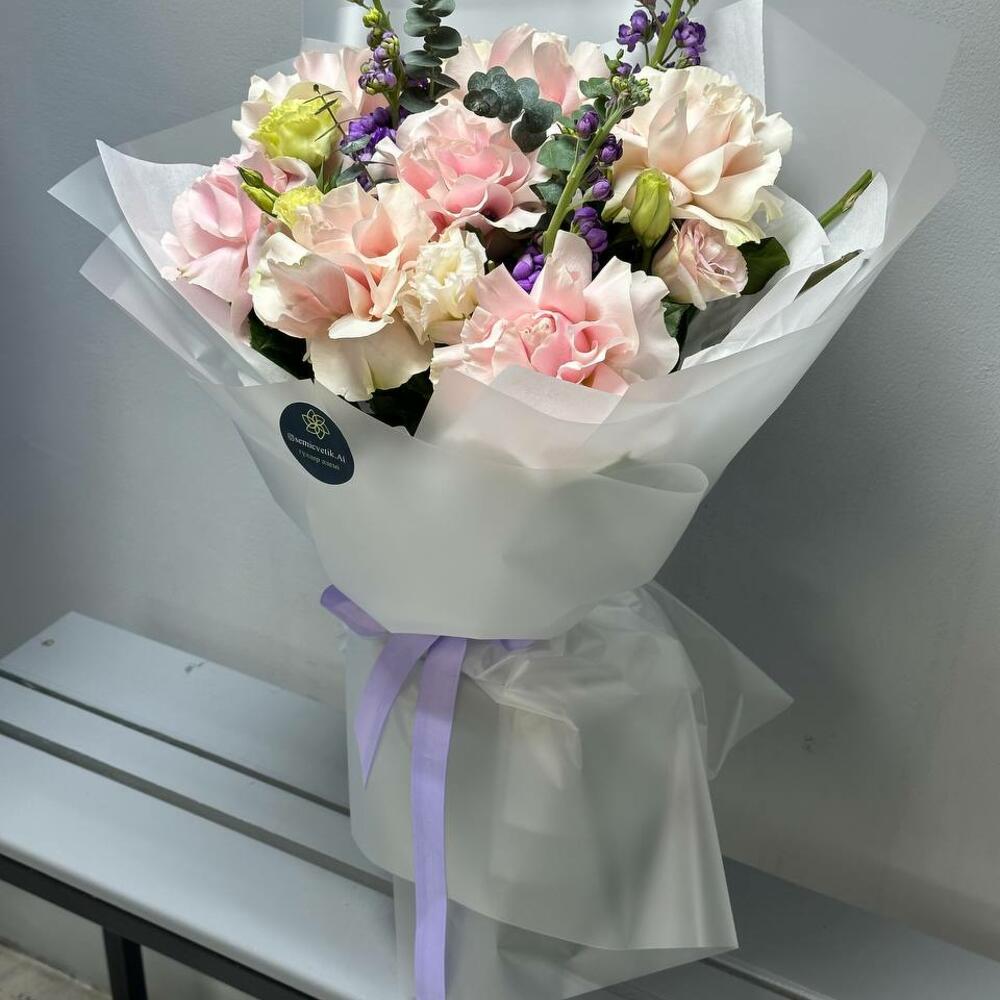 Букет «Лавандовая нежность» 💜🌿 Изысканный и утончённый, этот букет сочетает в себе романтику и свежесть. Нежные розовые розы 🌸 наполняют композицию мягкостью, а фиолетовая маттиола 💜 добавляет глубину и аристократичность. Белоснежный лизиантус 🤍 придаёт воздушность, а эвкалипт 🌿 освежает букет лёгкими зелёными нотами. Полупрозрачное серое оформление 🩶 подчёркивает изящество цветов, а светло-фиолетовая лента 🎀 завершает образ элегантным акцентом. 🎁 Прекрасный подарок для утончённых натур, которые ценят стиль и гармонию!