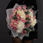 Гортензия - 4 шт. Роза кустовая - 7 шт. Эвкалипт - 2 шт. Упаковка - 1 шт. Аквабокс - 1 шт. переноска для цветов - 1 шт.