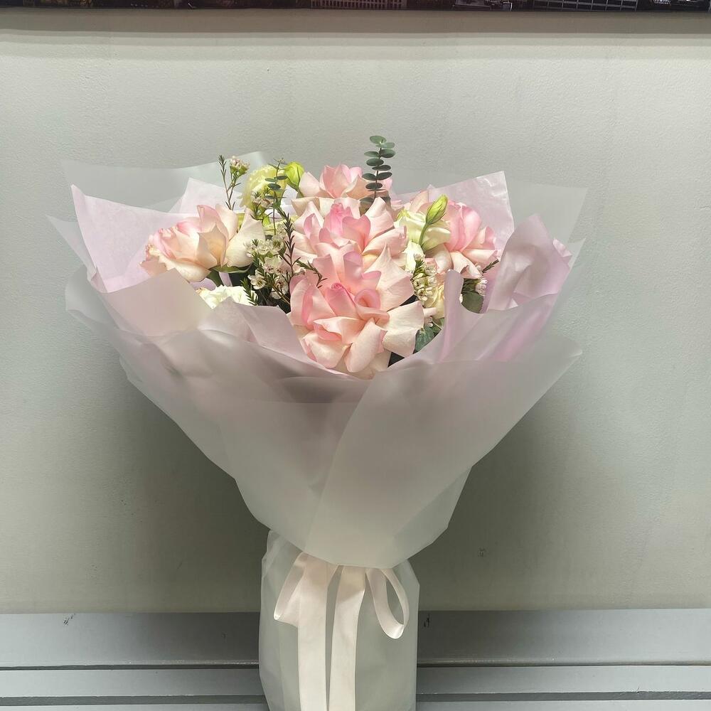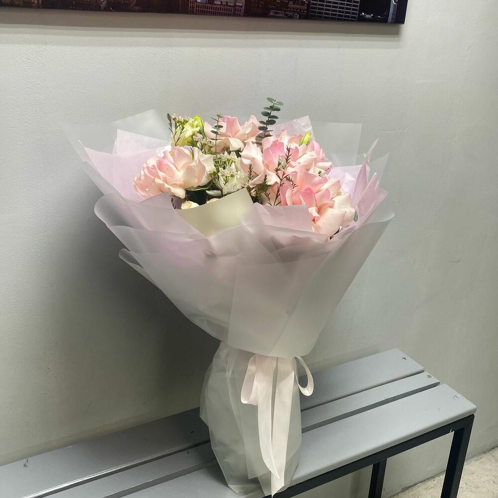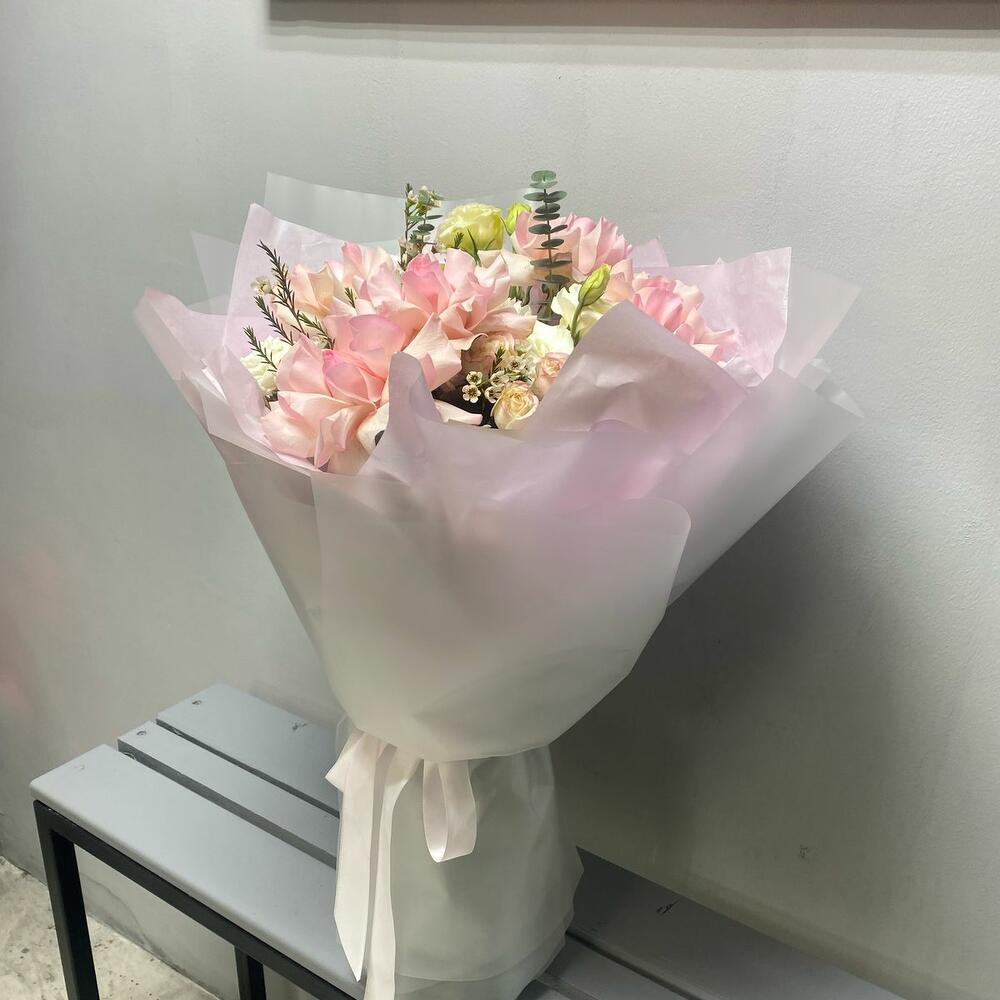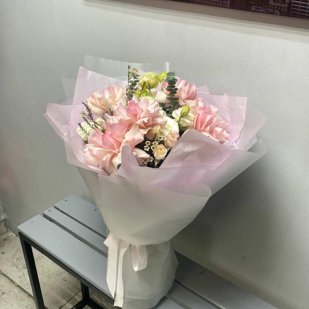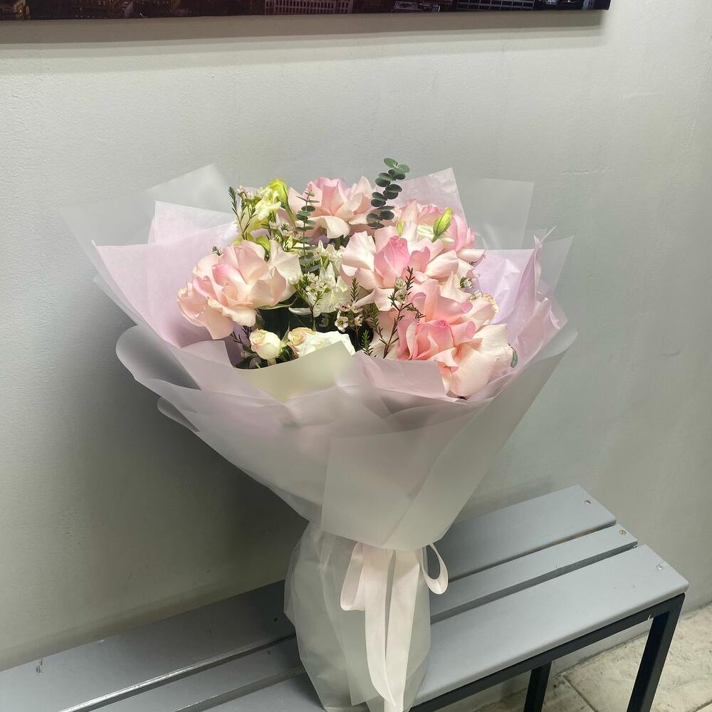 🌿 Легкость, нежность и изысканность в одном букете! 🌸 Этот утонченный букет словно соткан из самых нежных оттенков природы. Белые кустовые розы и лизиантусы олицетворяют чистоту и элегантность, а нежно-розовые розы добавляют теплоты и романтики. Легкость композиции подчеркивает эвкалипт Бэби-Блю, создавая ощущение воздушности. ✨ Полупрозрачное матовое оформление в сочетании с невесомой нежно-розовой тишью делает букет по-настоящему утонченным. Завершающий штрих — изящная репсовая лента, подчеркивающая нежный характер этой композиции. 🎀 Дарите моменты, наполненные теплотой и красотой! 💕