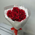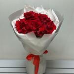 Роза красная - 5 шт. бумага тишью белая - 2 шт. лента репсовая красная - 1 шт. аква бумага серая - 4 шт.