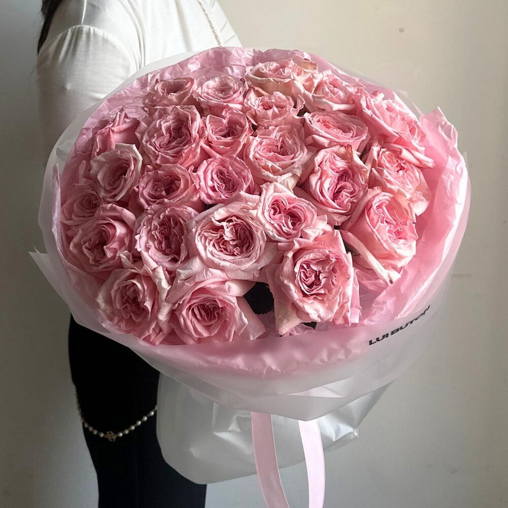 В букете из пионовидных роз сорта O’Hara всё идеально: цвет, аромат, форма. Он выглядит роскошно, но при этом не вычурно — как воплощение вкуса и изысканности
