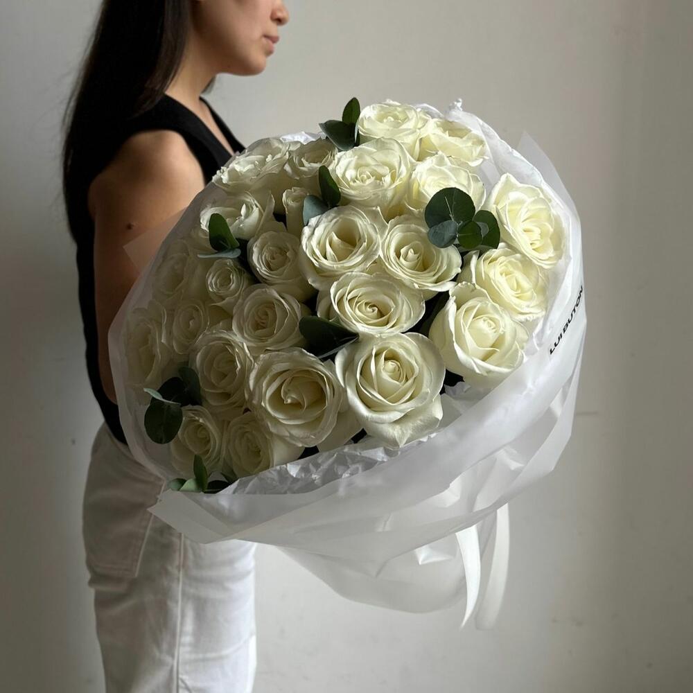 Букет из 25шт белых роз с эвкалиптом идеально подойдёт для поздравлений и сюрпризов