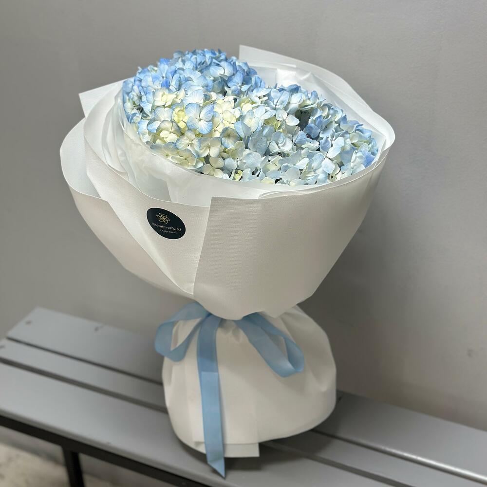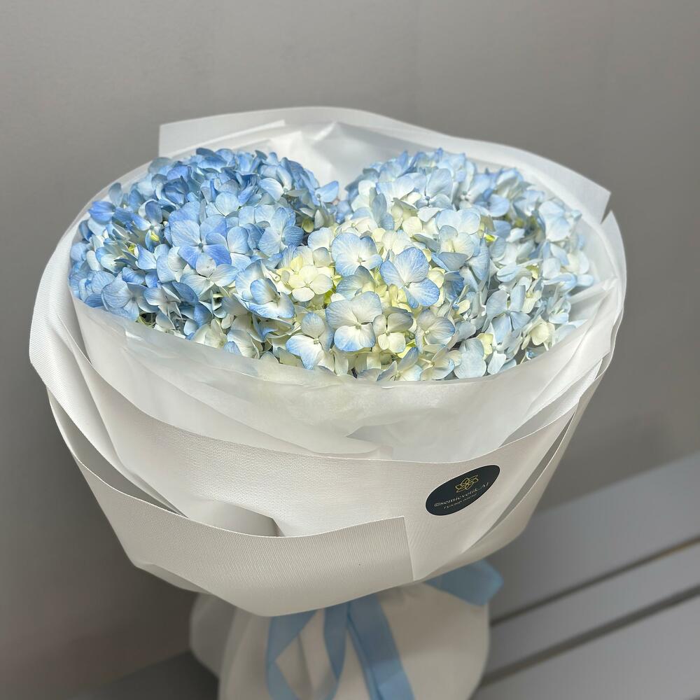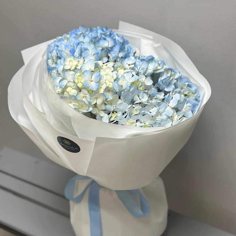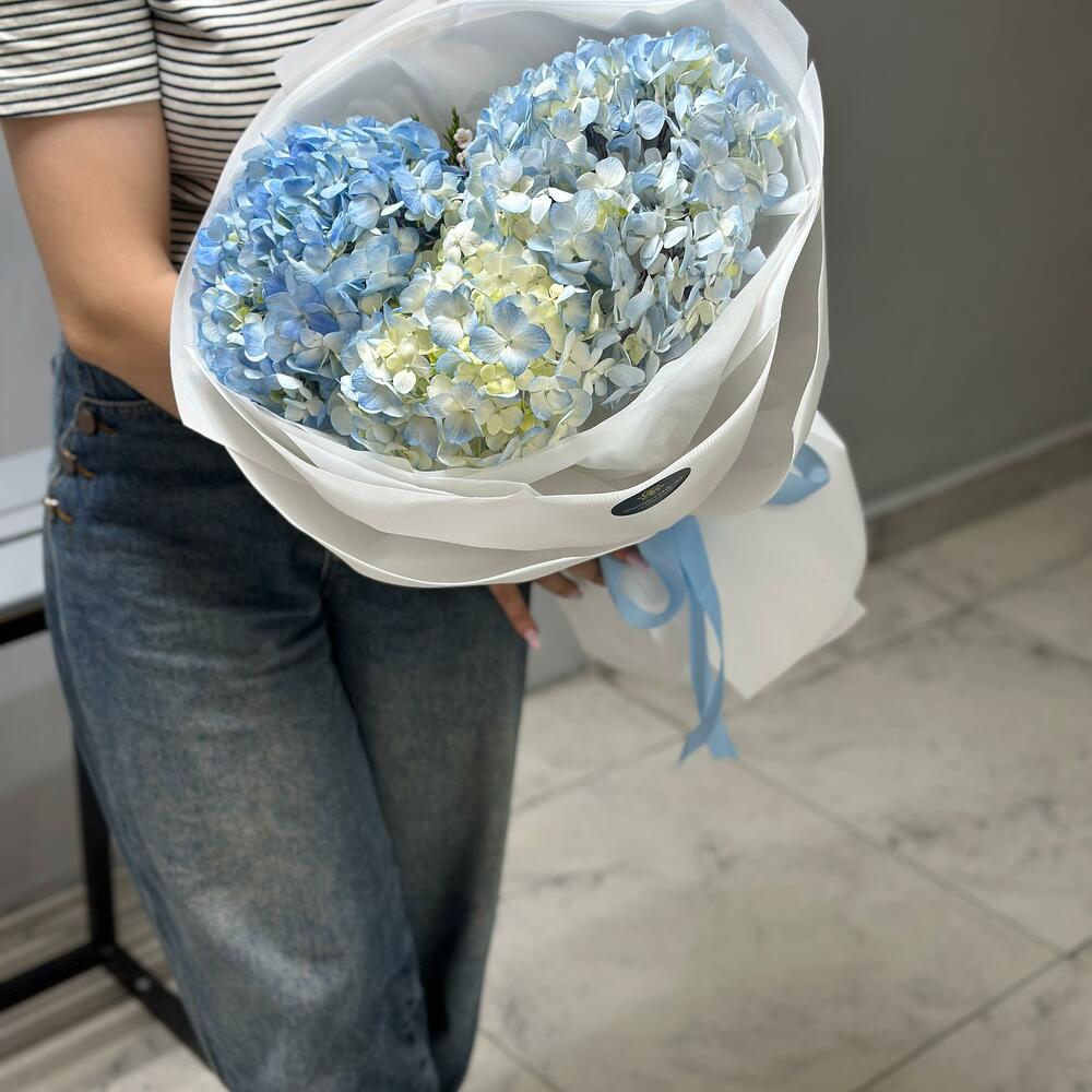 “Небесная нежность” ☁️💙 Букет, вдохновлённый лёгкостью облаков и свежестью весеннего утра! 3 воздушные голубые гортензии наполняют композицию гармонией и спокойствием, создавая ощущение чистоты и уюта 🌿✨. Обёрнутый в белую тишью и полупрозрачную матовую бумагу, он выглядит невесомым, словно лёгкий ветерок. А голубая репсовая лента добавляет элегантный акцент 🎀. ✨ “Небесная нежность” – утончённый подарок, который говорит о заботе, лёгкости и искренности. 💙