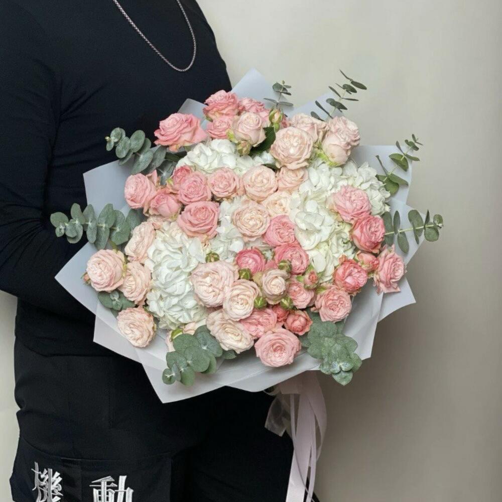Круглый сборный букет из пионовидных кустовых роз, гортензии и эвкалипта. В стильной упаковке и удобной переноске на аквабоксе.