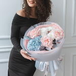 Лента - 1 шт. Рускус - 3 шт. Хризантема Зембла белая - 1 шт. Гортензия синяя - 1 шт. Оформление - 1 шт. пионовидная роза pink o'hara - 3 шт.