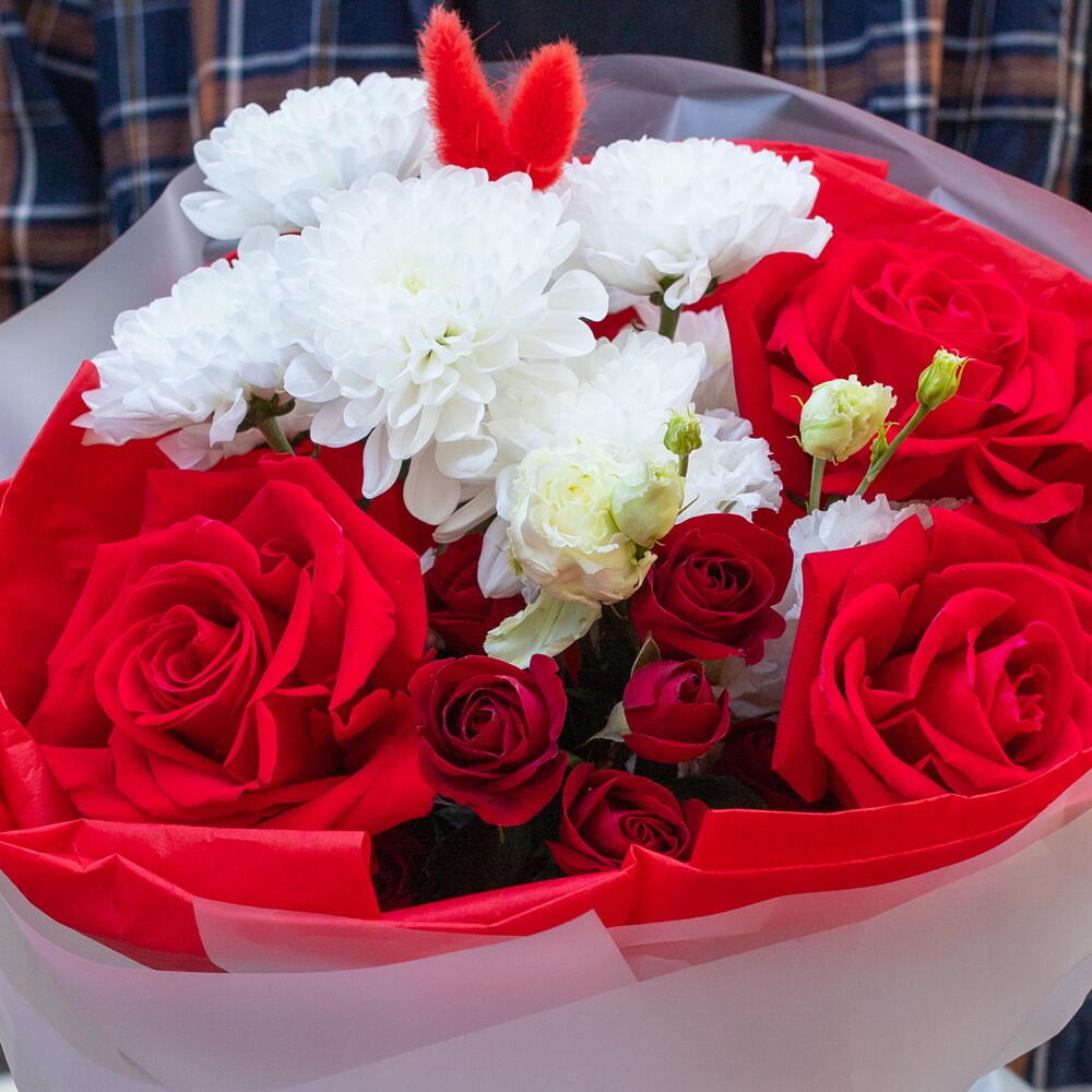 Хризантема Зембла белая - 1 шт. Лагурус - 5 шт. Роза кустовая Микс - 1 шт. роза reedom - 3 шт. эустома гелеб белая - 1 шт.