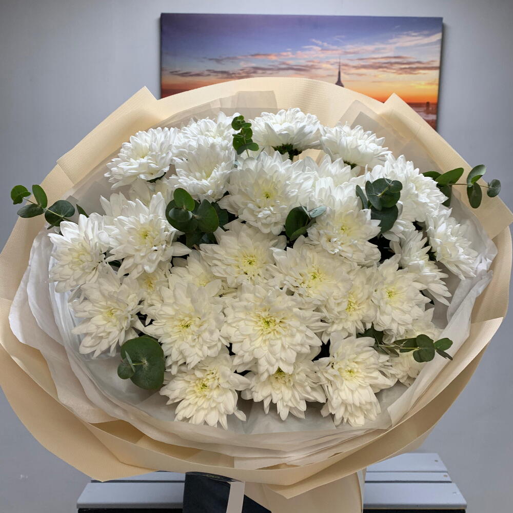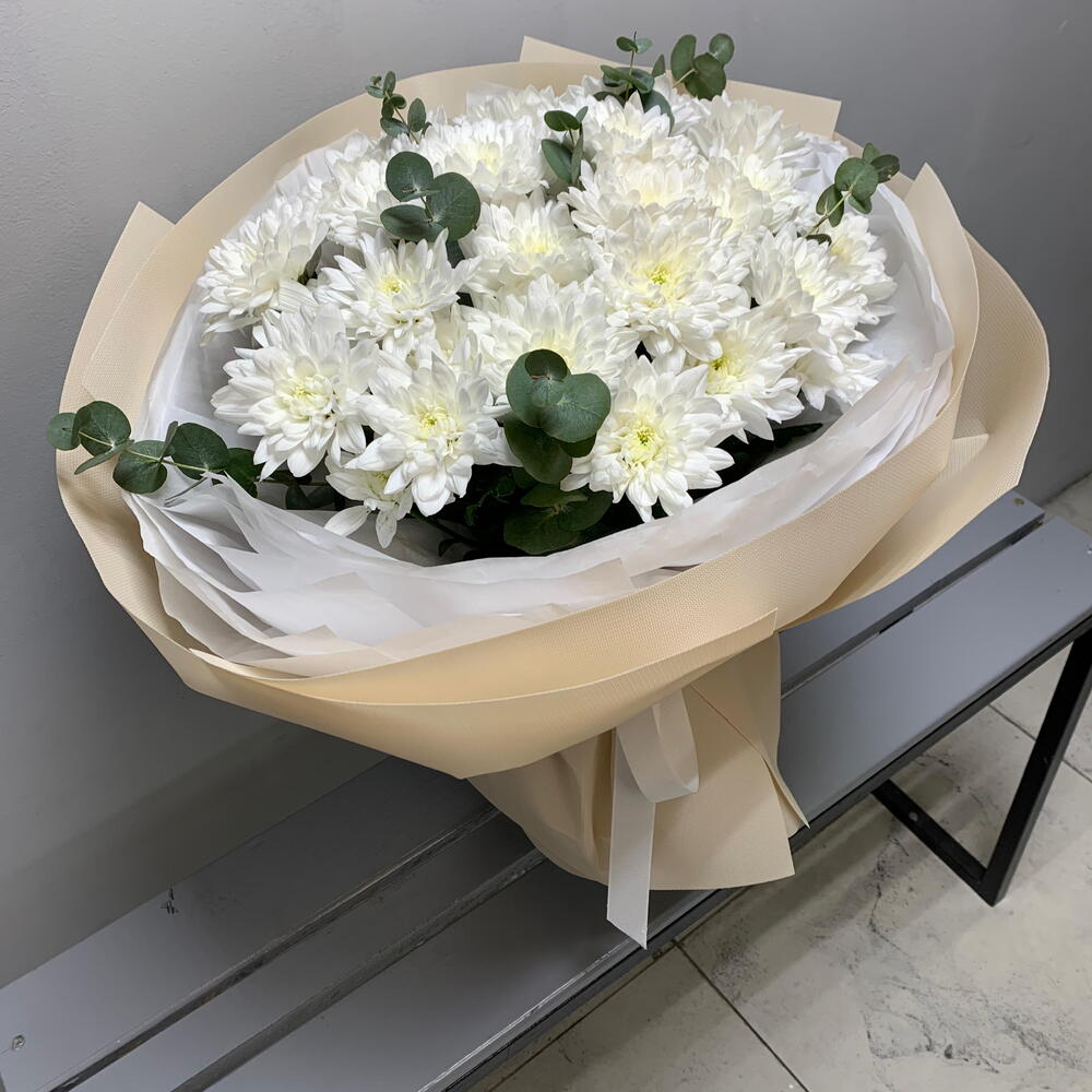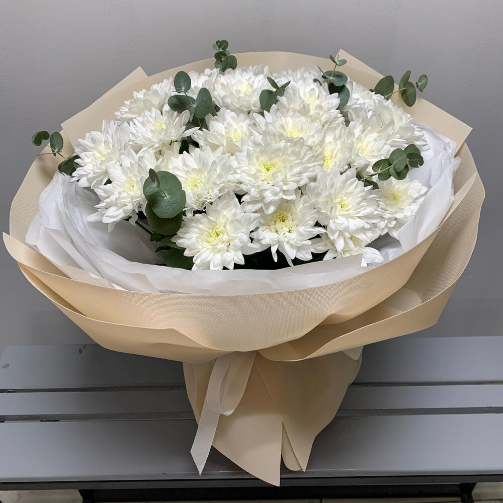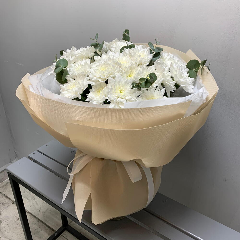 Эвкалипт - 1 шт. Хризантема балтика белая - 7 шт. бумага тишью белая - 4 шт. лента репсовая белая - 1 шт. фоамиран бежевый - 4 шт.