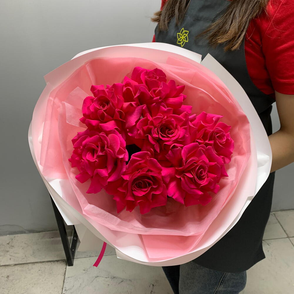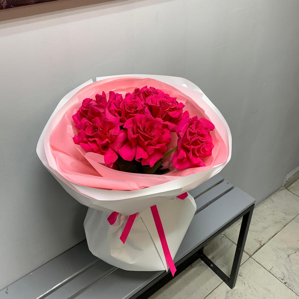 💖 «Малиновый Шепот» 💖 Этот букет — как первое признание в любви, нежный, но смелый. ✨ 7 малиновых роз — символ страсти и тепла, обёрнуты в воздушную розовую тишью, как в облако мечты, а стильная белая аква-бумага и оформление добавляют элегантности и сдержанного шарма. Ярко-розовая репсовая лента 🎀 — финальный акцент, словно поцелуй. 💐 «Малиновый Шепот» — для тех, кто хочет сказать больше, чем просто «мне нравится». Подарите эмоции, которые останутся в памяти! ✨