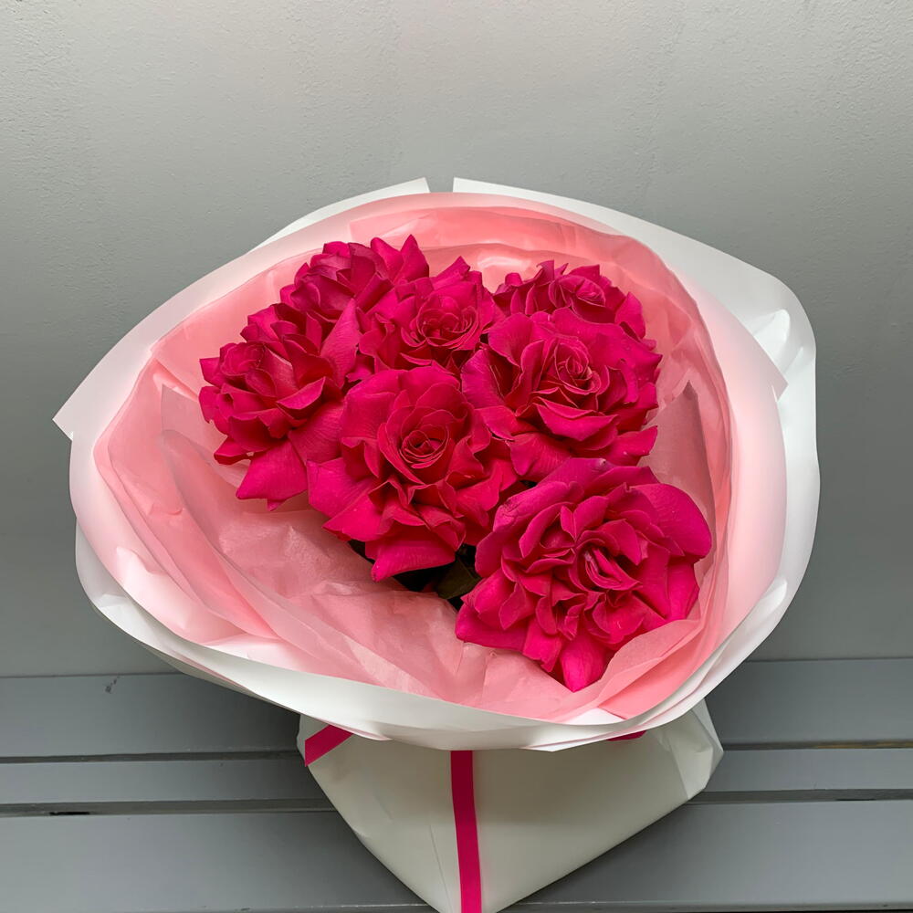 Роза малиновая - 7 шт. бумага тишью розовая - 4 шт. аква бумага белая - 4 шт. лента репсовая ярко-розовая - 1 шт.