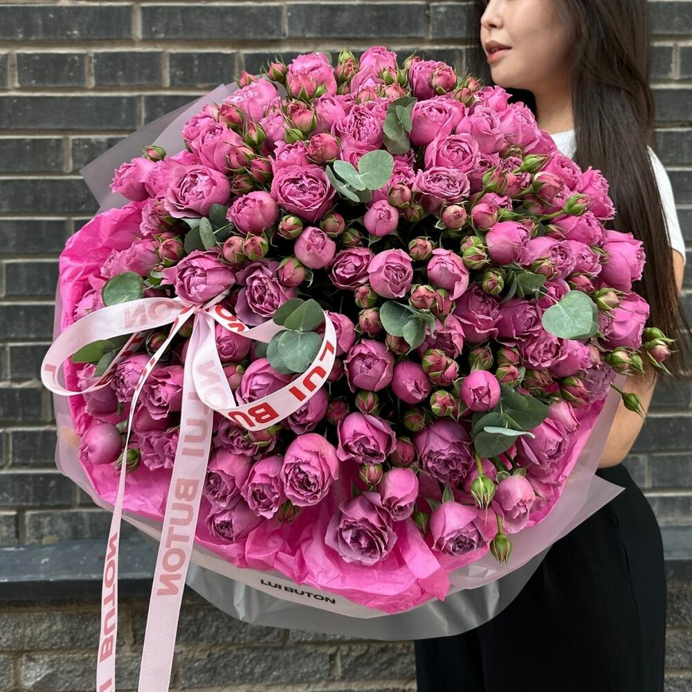 Этот букет из 31шт кустовых пионовидных роз с эвкалиптом создан, чтобы радовать — нежный, свежий и вдохновляющий
