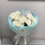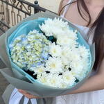 Хризантема кустовая Белая - 4 шт. Гортензия голубая - 1 шт. лента репсовая белая - 1 шт. бумага тишью голубая - 4 шт. аква бумага полупрозрачная матовая - 4 шт.