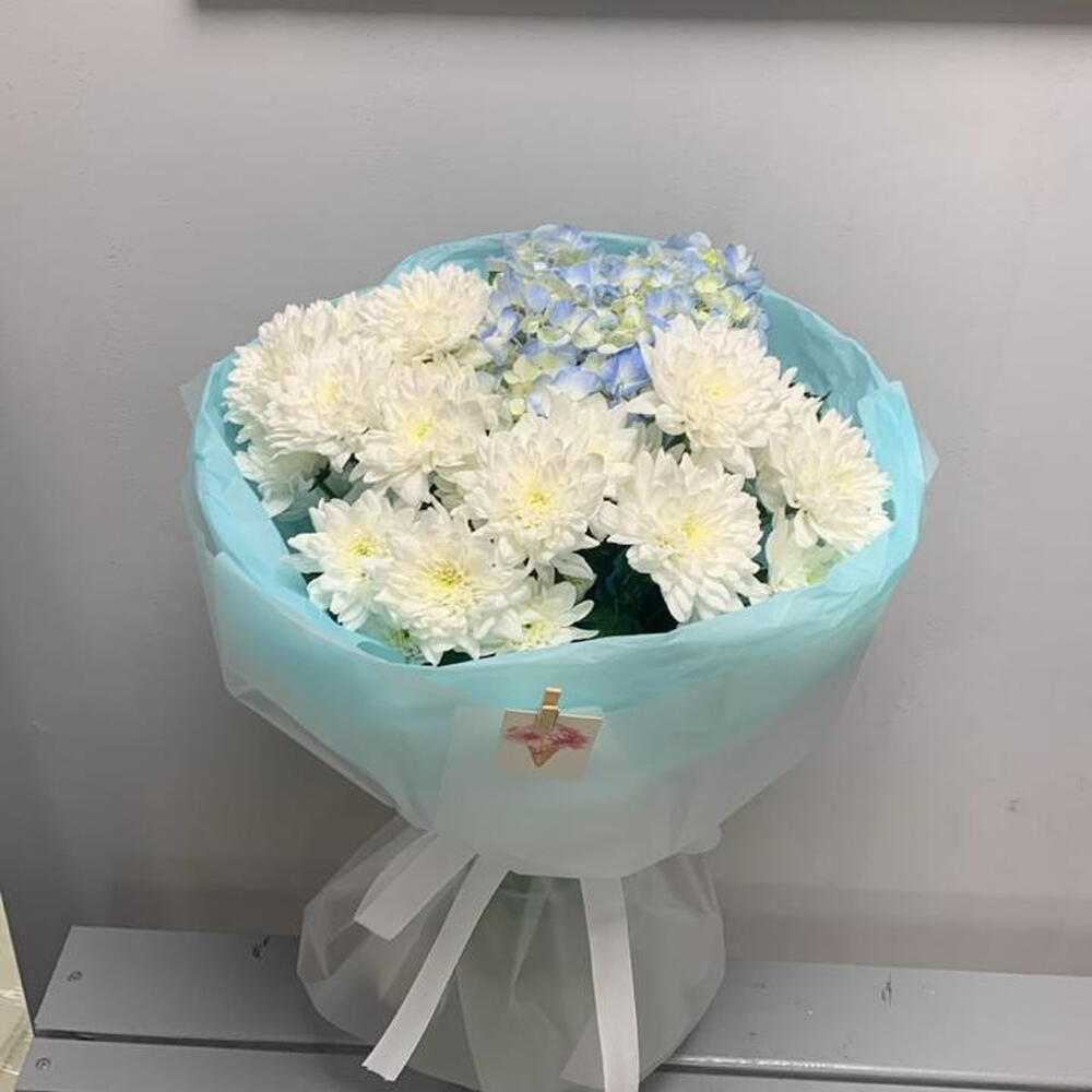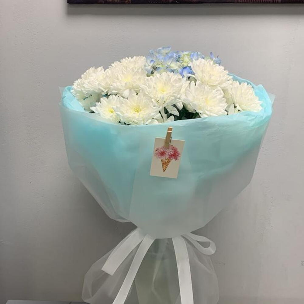Хризантема кустовая Белая - 4 шт. Гортензия голубая - 1 шт. лента репсовая белая - 1 шт. бумага тишью голубая - 4 шт. аква бумага полупрозрачная матовая - 4 шт.