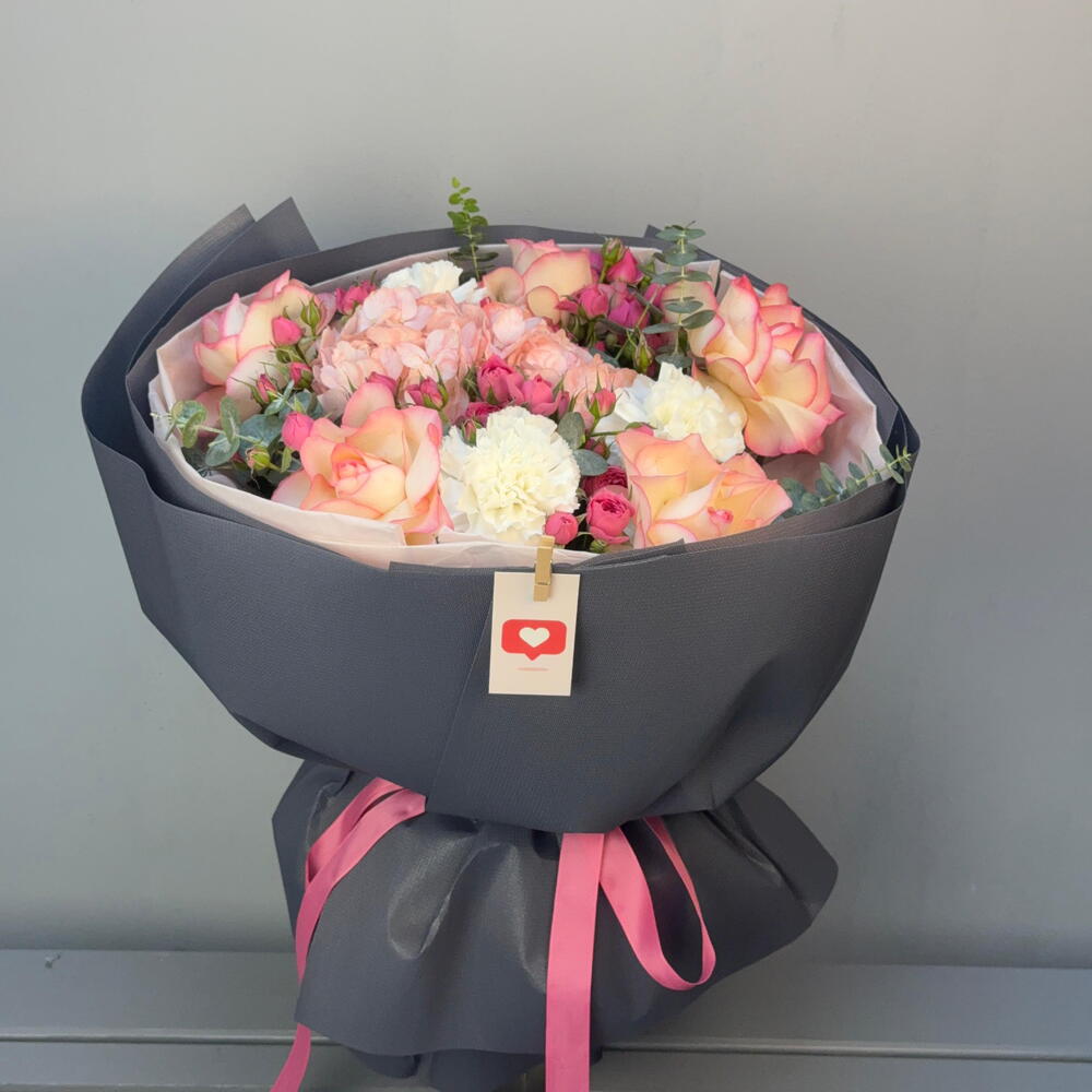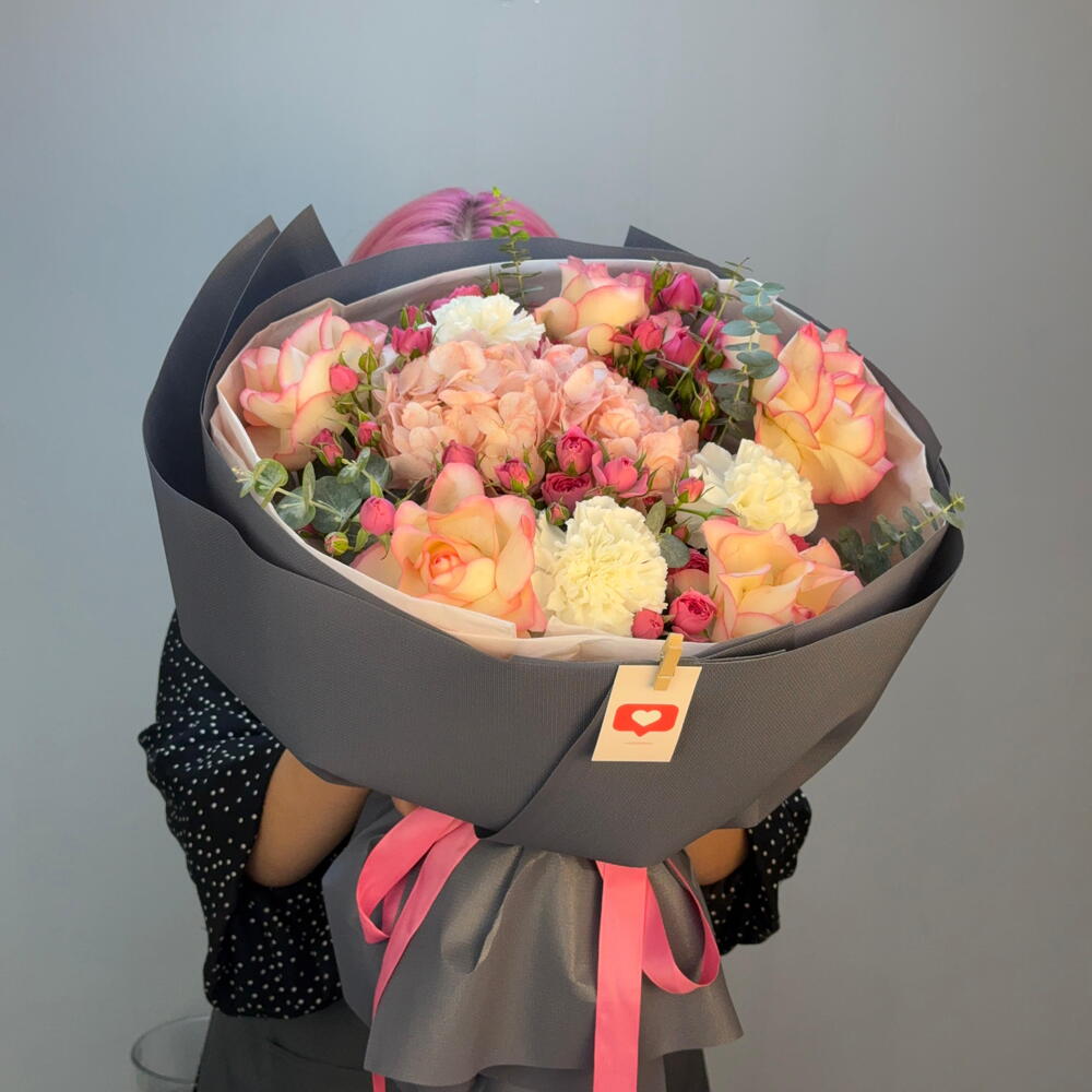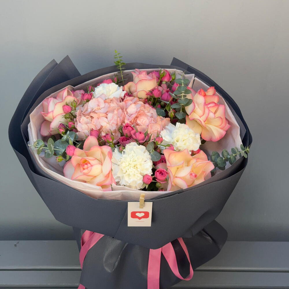 🌷 Розовый Рассвет 🌷 Описание: Этот букет — как нежный рассвет, который нежно просыпается и наполняет мир мягкими красками. 🌸 Розовые гортензии, словно утренний туман, дарят ощущение свежести, а белые гвоздики добавляют легкости и утонченности. 🌿 🌹 Кустовые розы София и нежные розы розового оттенка создают атмосферу тепла и романтики, а эвкалипт Бэби-блю наполняет композицию легким зелёным акцентом, словно свежий ветер в раннем утре. 💖 Каждый цветок в букете — это символ изысканности и элегантности, а оформление в темно-серой бумаге и лентах придает композиции изысканность и стиль. 🎀 Идеален для: 💐 Подарка на важное событие 🌷 Романтического сюрприза 🌸 Эмоционального акцента в любом интерьере Дайте волю эмоциям с этим великолепным букетом! 🌹💖