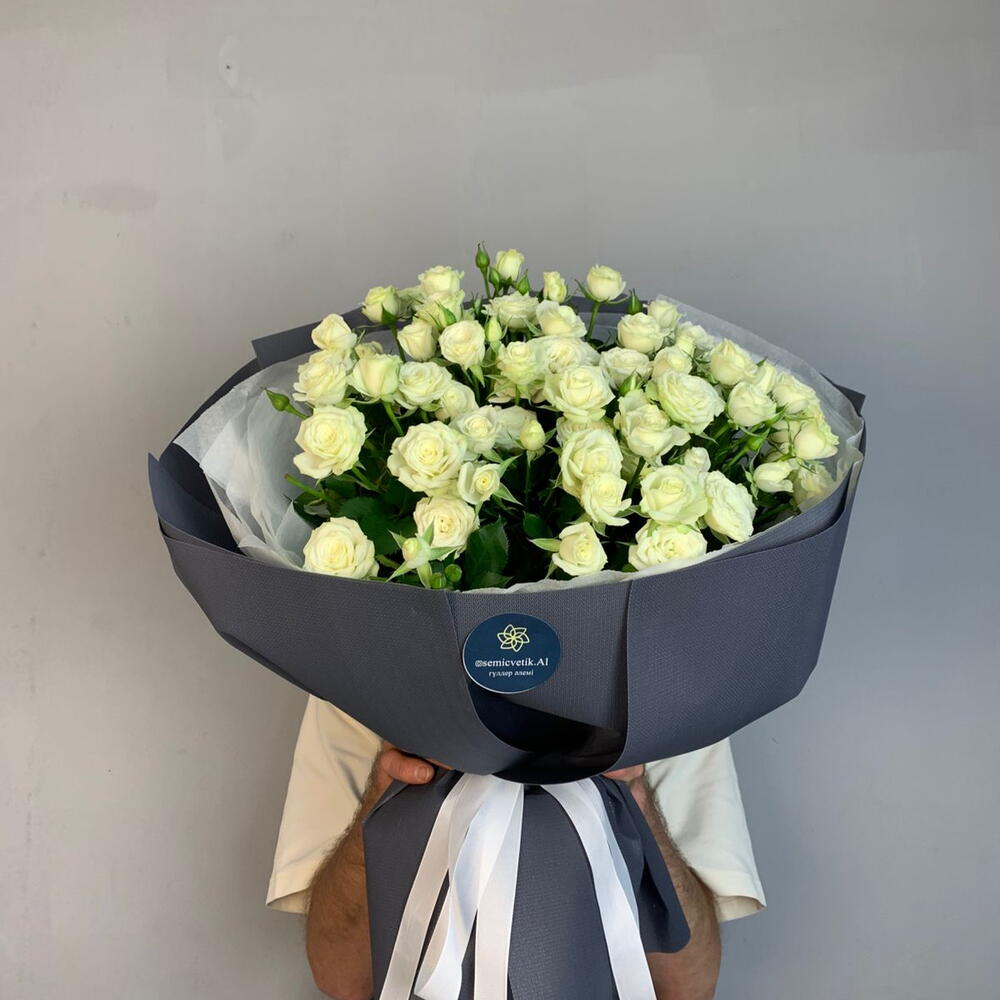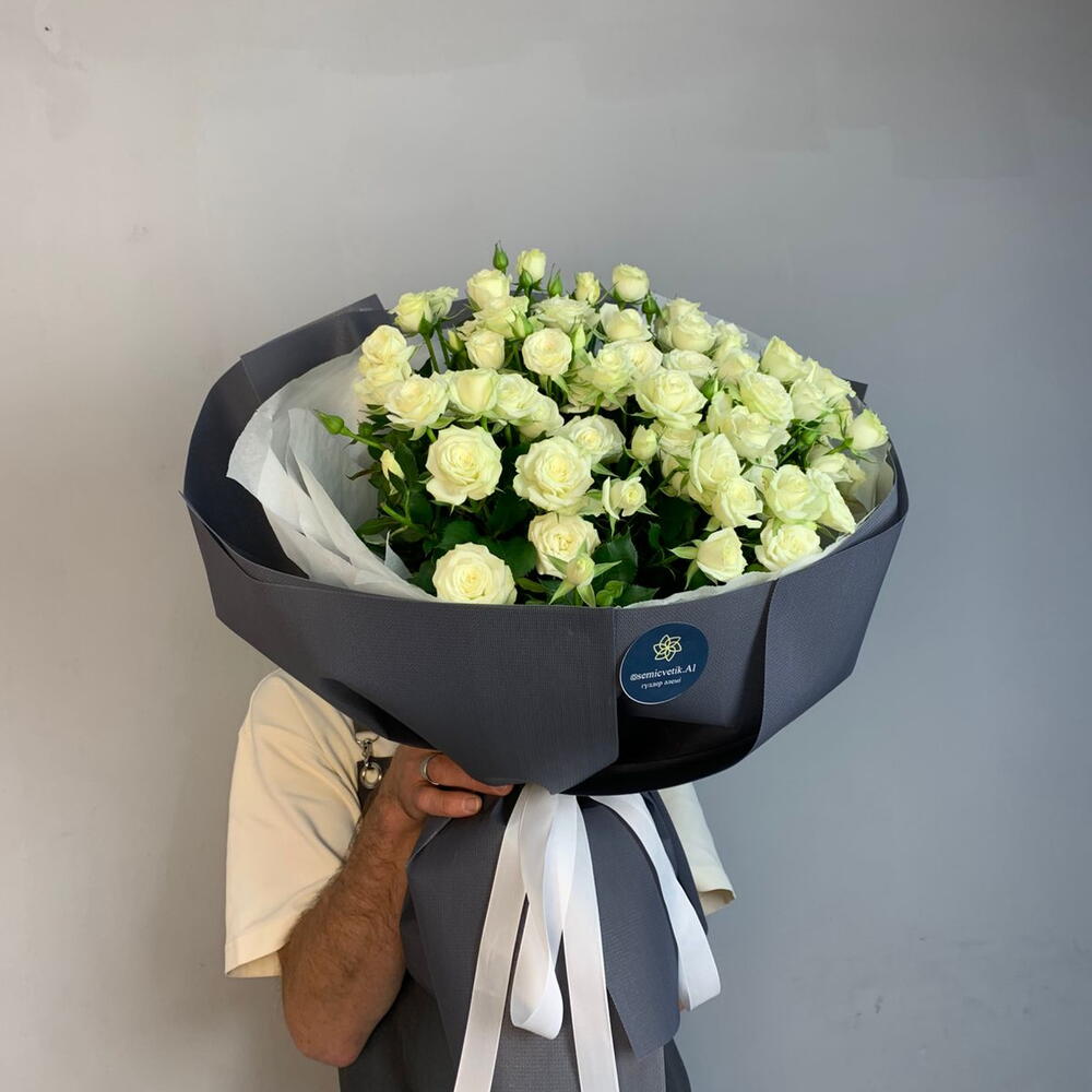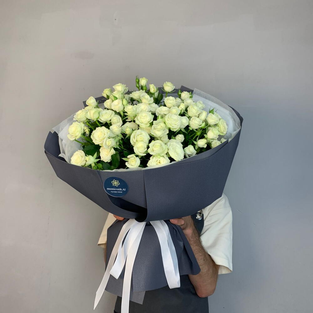 Роза кустовая белая - 13 шт. фоамиран серый - 4 шт. бумага тишью белая - 4 шт. лента репсовая белая - 1 шт.