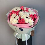 🌿✨ Букет «Нежное дыхание» ✨🌿 🤍 5 белоснежных кустовых хризантем — символ чистоты и искренности. 🌸 5 розовых кустовых роз добавляют тепла, нежности и романтики. 🎀 Белая репсовая лента и розовая тишью-подложка подчёркивают изящество композиции. 💚 Светло-зелёный фоамиран в оформлении делает букет свежим и лёгким, словно весеннее утро. Такой букет подойдёт для признаний, искренних поздравлений и тех моментов, когда слова излишни 🌷💫