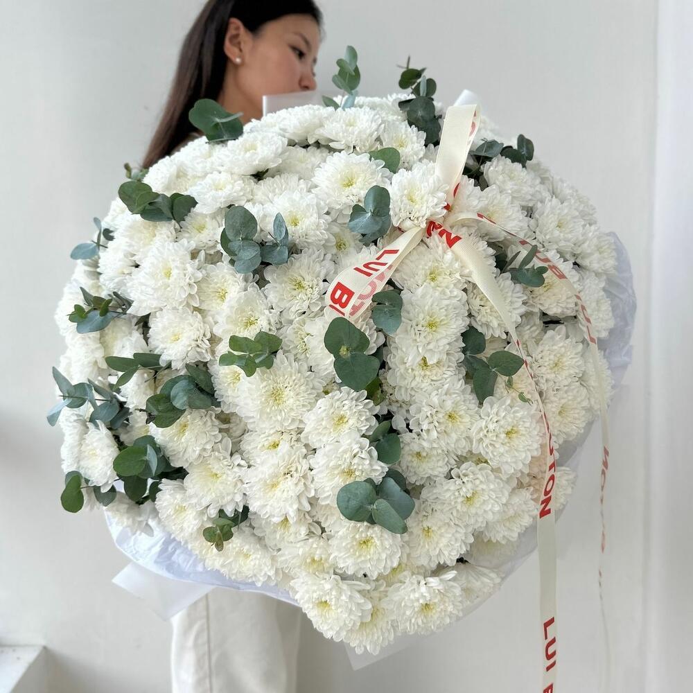 Букет "35 хризантем с эвкалиптом"