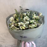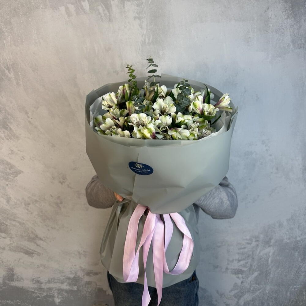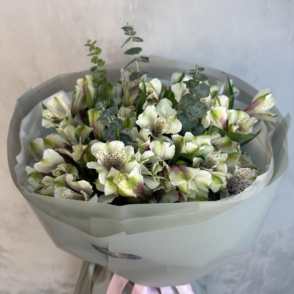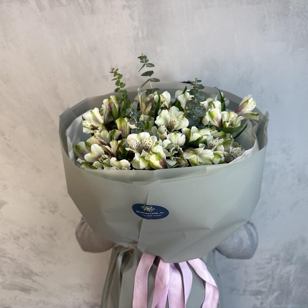 Букет 357 «Северная нежность» 🤍🌿 Изысканный букет из 11 альстромерий «Белоснежка», дополненный свежим эвкалиптом Baby Blue 🌿 Полупрозрачное серое оформление создаёт эффект лёгкости и воздуха, а нежно-фиолетовая лента добавляет утончённый акцент 🎀 Этот букет про: 🤍 спокойную элегантность 🤍 стиль и минимализм 🤍 заботу, которая чувствуется без слов Идеальный выбор для тех, кто ценит сдержанную красоту и вкус ✨💐 Минимализм, который говорит о вкусе и чувствах 🌫️🌸
