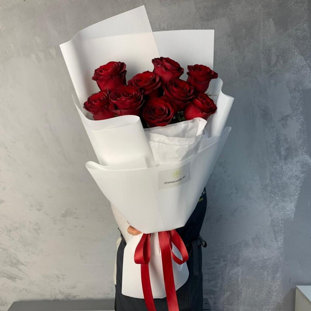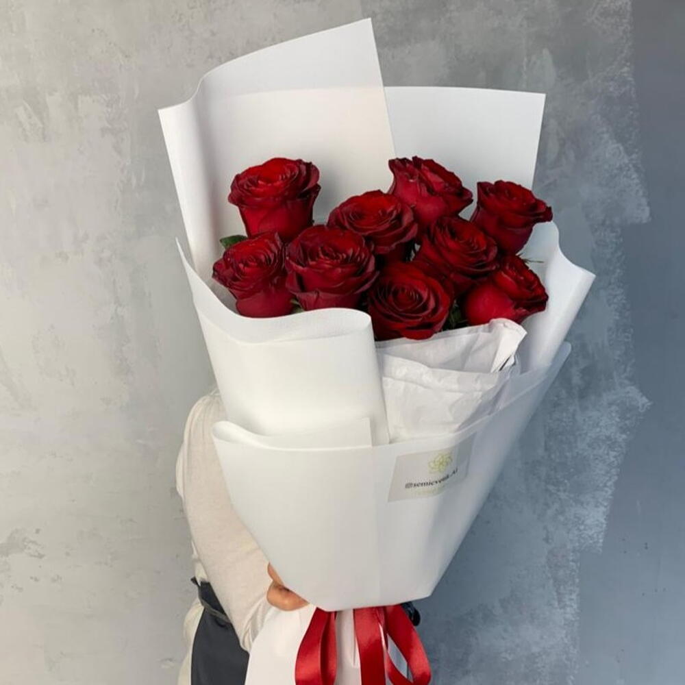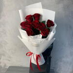 Роза красная - 7 шт. фоамиран белый - 4 шт. бумага тишью белая - 4 шт. лента репсовая красная - 1 шт.