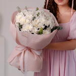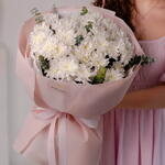 Эвкалипт - 3 шт. Хризантема кустовая Белая - 7 шт. бумага тишью белая - 4 шт. фоамиран нежно-розовый - 4 шт. лента репсовая нежно-розовая - 1 шт.