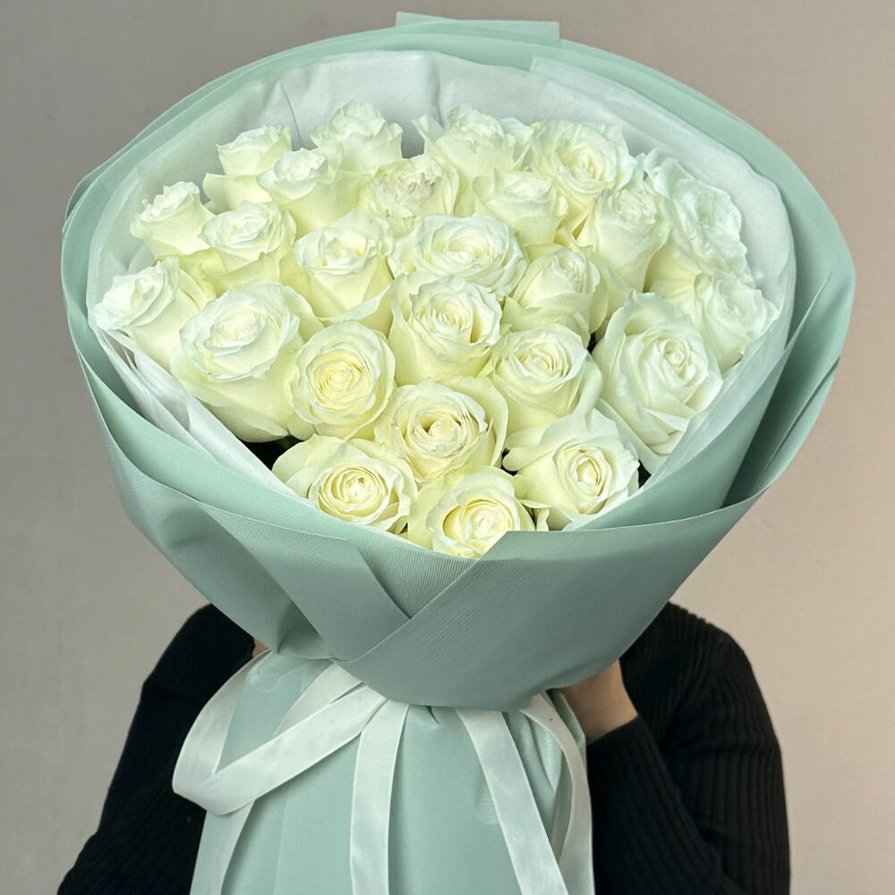 Роза белая - 25 шт. бумага тишью белая - 4 шт. лента репсовая белая - 1 шт. фоамиран фисташковый - 4 шт.