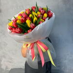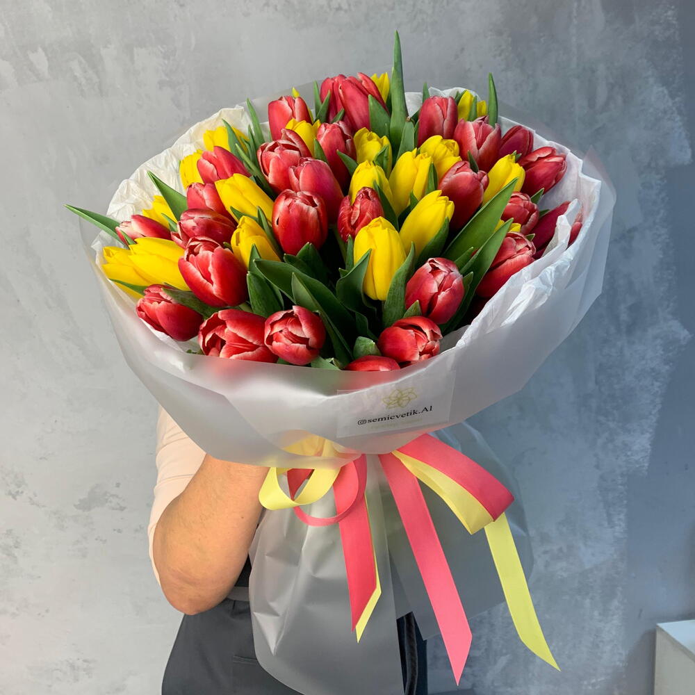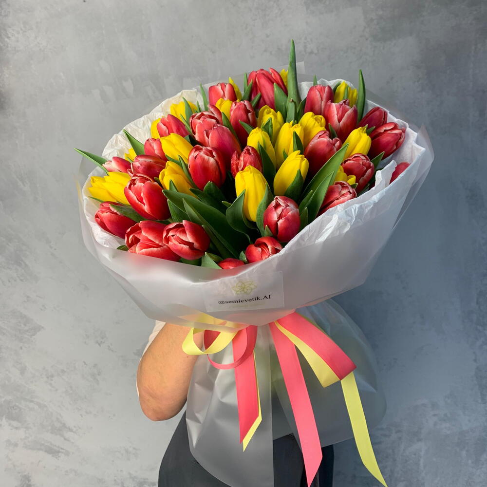 🌷🔥 Букет 377 «Огонь и Солнце» 51 жёлто-красный тюльпан — это всплеск эмоций, радости и яркого характера 💛❤️ Сочные оттенки солнца и пламени собраны в лёгкое полупрозрачное матовое оформление с белой тишью — букет выглядит воздушно, но при этом очень выразительно ✨ 🌞 Жёлтые тюльпаны — про счастье и тепло ❤️ Красные — про страсть и сильные чувства 💐 51 цветок — эффектный, запоминающийся жест 🎀 Ленты в розово-жёлтой гамме красиво связывают композицию в единый яркий образ Этот букет дарят тем, кто зажигает сердце. Тем, рядом с кем жизнь становится ярче 🌷🔥
