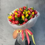 бумага тишью белая - 4 шт. тюльпаны желтые и красные - 51 шт. аква бумага полупрозрачная матовая - 4 шт. лента репсовая розовая и желтая - 2 шт.