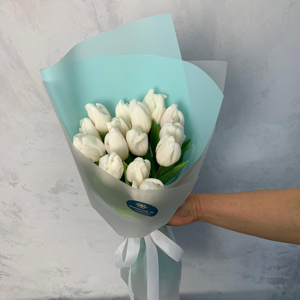 лента репсовая белая - 1 шт. тюльпаны белые - 15 шт. аква бумага полупрозрачная матовая - 3 шт.