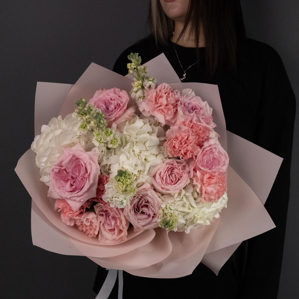 Круглый сборный букет из пионовидных ароматных роз сорта охара, ароматной маттиола, диантусов и гортензии. В стильной упаковке и удобной переноске на аквабоксе.